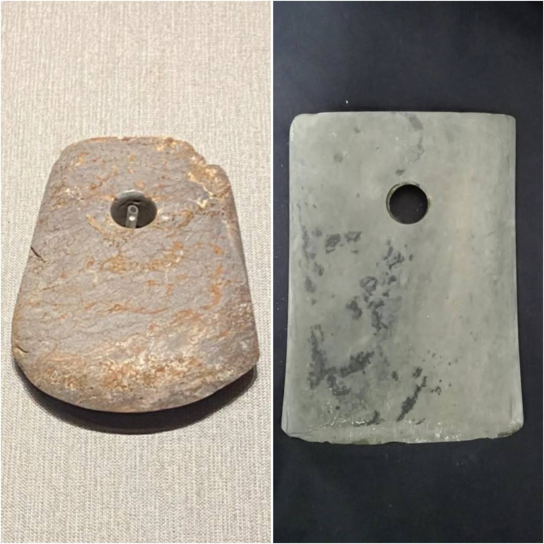 △ 大汶口文化中期的石钺(左)和大汶口文化晚期的玉钺(右)