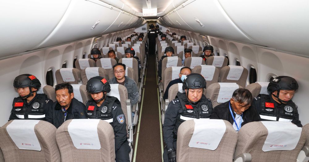 2024年1月30日,缅甸警方依法向我公安机关移交的白所成、白应苍、魏怀仁、刘正祥、刘正茂、徐老发6名缅北果敢电诈犯罪集团重要头目和另外4名重大犯罪嫌疑人在被押解回国的飞机上。新华社记者 殷刚 摄