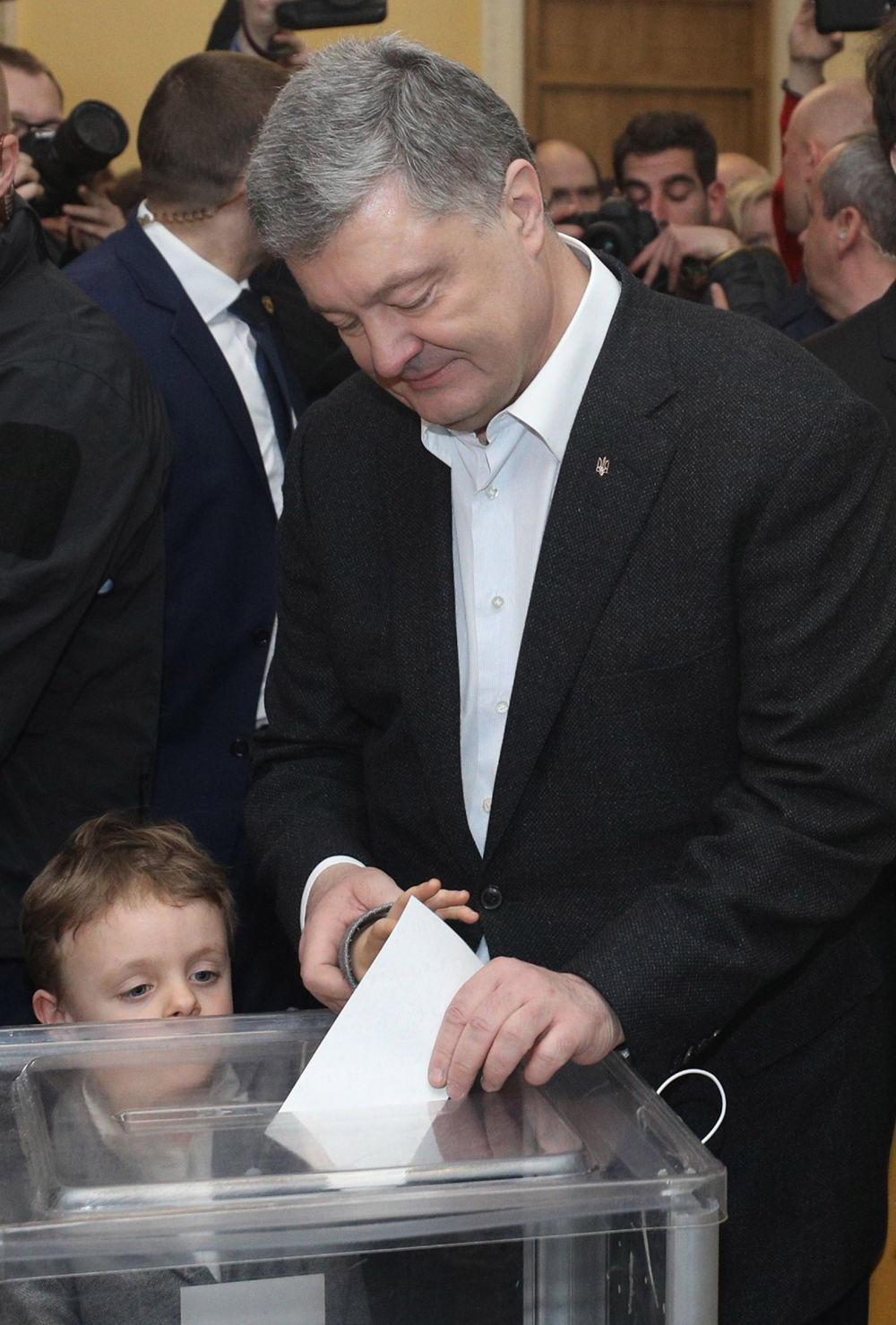 2019年4月21日,乌克兰时任总统波罗申科在首都基辅一处投票站将选票投入票箱。新华社发(乌克兰总统新闻局供图)