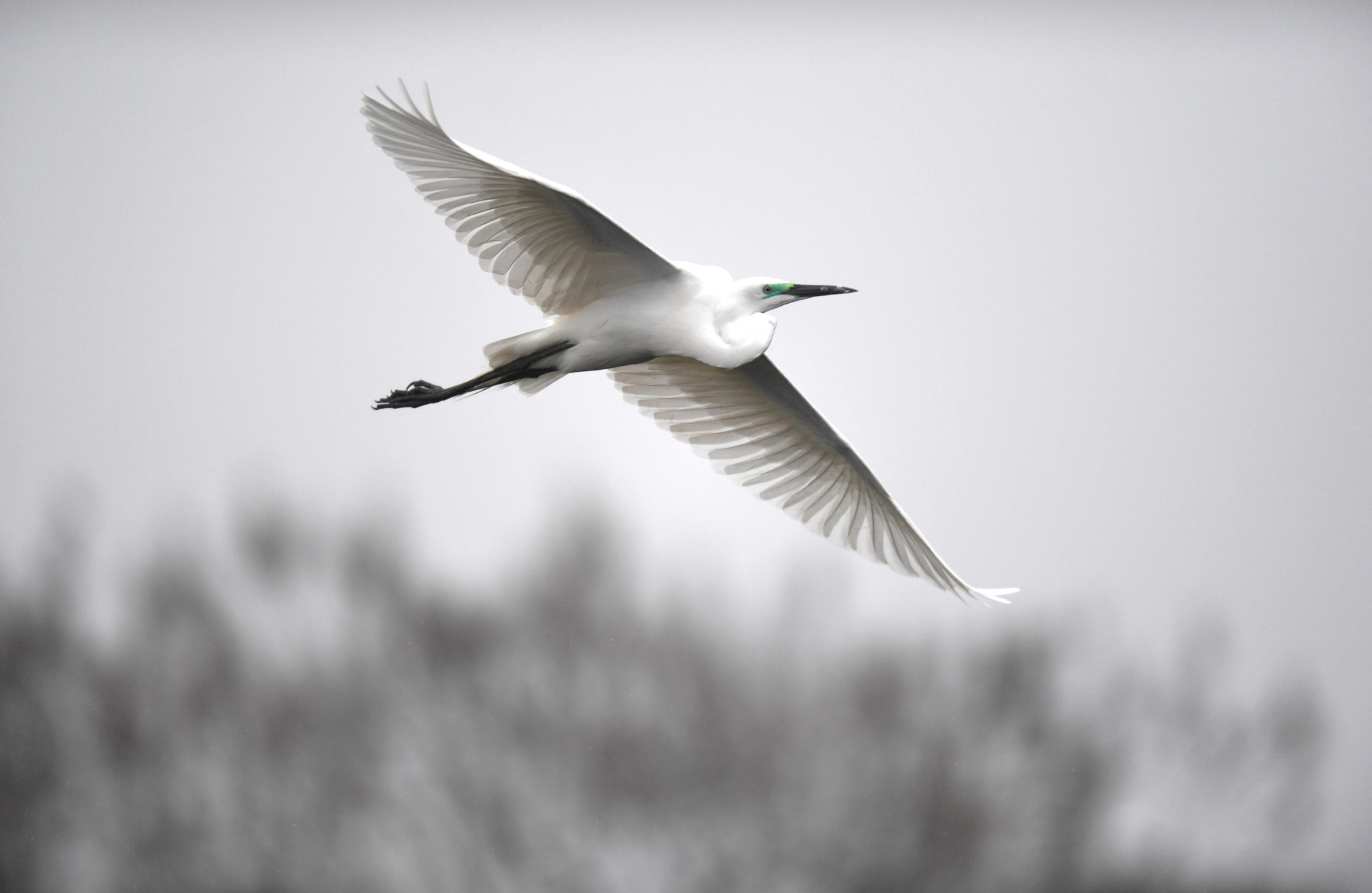 3月10日,一只白鹭在象山森林公园上空飞翔。