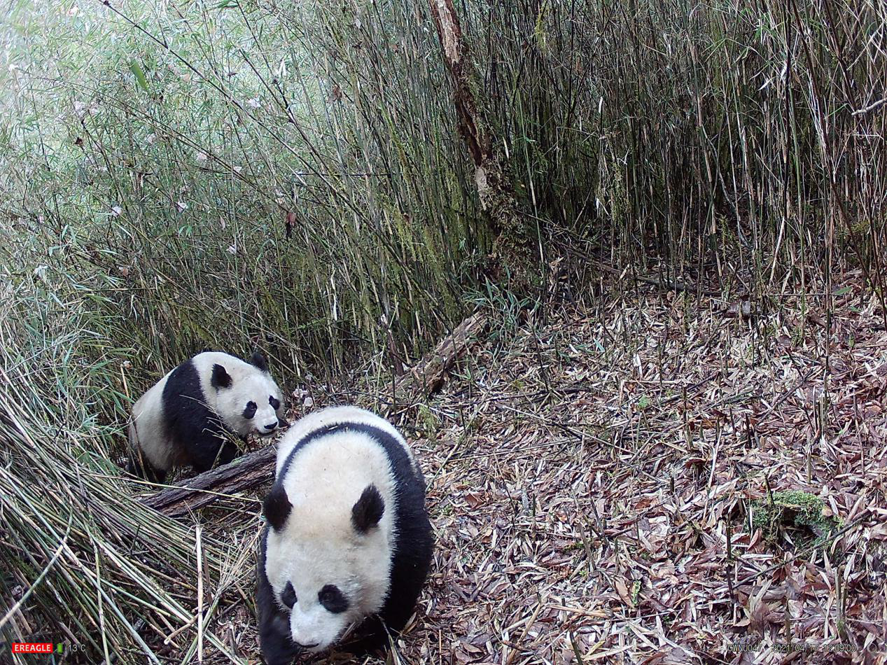 在这个拍摄于今年4月的画面中,在被翠竹环绕的一片空地上,突然出现了一前一后的两只大熊猫,它们体态丰盈,边嗅着草木边在红外相机前漫步。
