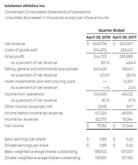 加拿大瑜伽品牌lululemon(LULU.NASDAQ)昨日发布第一季度业绩数据显示,在截至4月29日的三个月内,其销售额同比大涨24.9%至6.497亿美元,净利润则同比猛涨141%至7520万美元,均超过分析师预期。