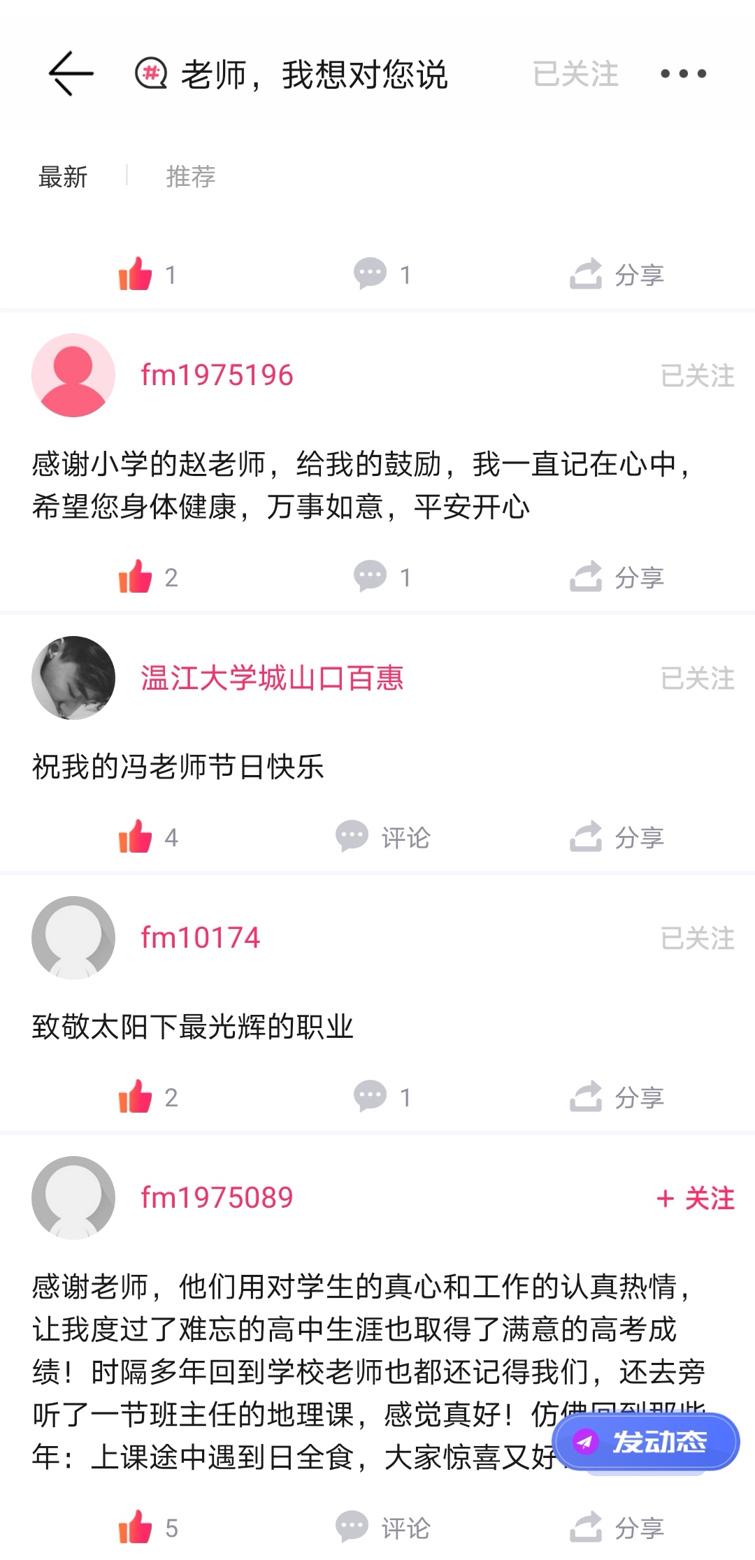 一名叫胡淏渊的用户,对老师田玉历(成都石室小学)表达了浓浓感激:加减乘除,算不尽无私奉献!诗词歌赋,颂不完心中崇敬!老师用知识甘露,浇开我们理想的花朵;用心灵清泉,润玉我们的美果。老师您辛苦了!值得注意的是,在众多留言中,有三名网友都表白了成都七中实验小学老师李娟,还有网友对家里的老师送出了祝福,一名叫“一只”的网友决定“国庆回老家看看恩师”。