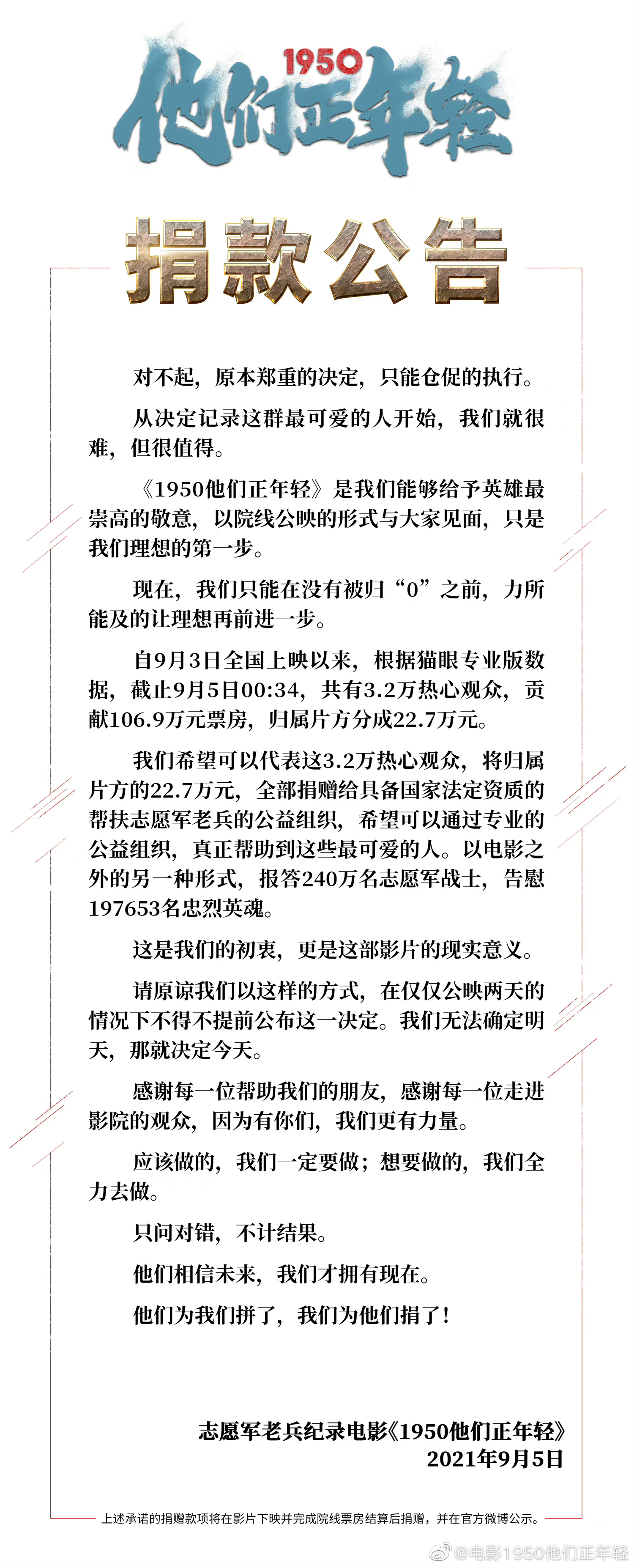 捐款公告中显示,截至9月5日00:34,共有3.2万观影人次,贡献106.9万元票房。归属片方分成的22.7万元将用于捐赠。“希望可以通过专业的公益组织,真正帮助到这些最可爱的人。以电影之外的另一种形式,报答240万名志愿军战士,告慰197653名忠烈英魂。”