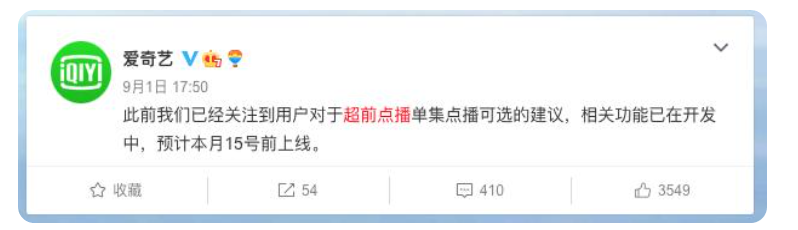 此前,中国消费者协会发文称,对视频平台广受诟病的超前点播模式进行了批评,表示超前点播重自愿,逐集限制要取消。被点名批评后,腾讯视频、爱奇艺等视频平台均在本月初回应了超前点播需“逐集解锁”的争议,并明确表示会调整超前点播的解锁规则。