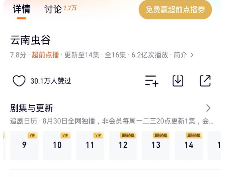 9月9日,有网友发现,腾讯视频正在播出的《云南虫谷》的超前点播已经可以选集解锁了。同时,爱奇艺超前点播单集可选的功能也预计于本月15日上线;优酷超前点播单集解锁功能也正在研发中。