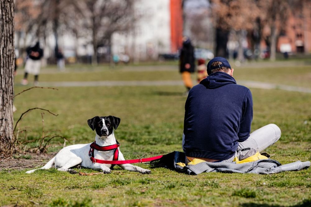 2020年3月28日,在德国首都柏林,一名男子带着宠物狗坐在公园草地上。(新华社发 张平摄)