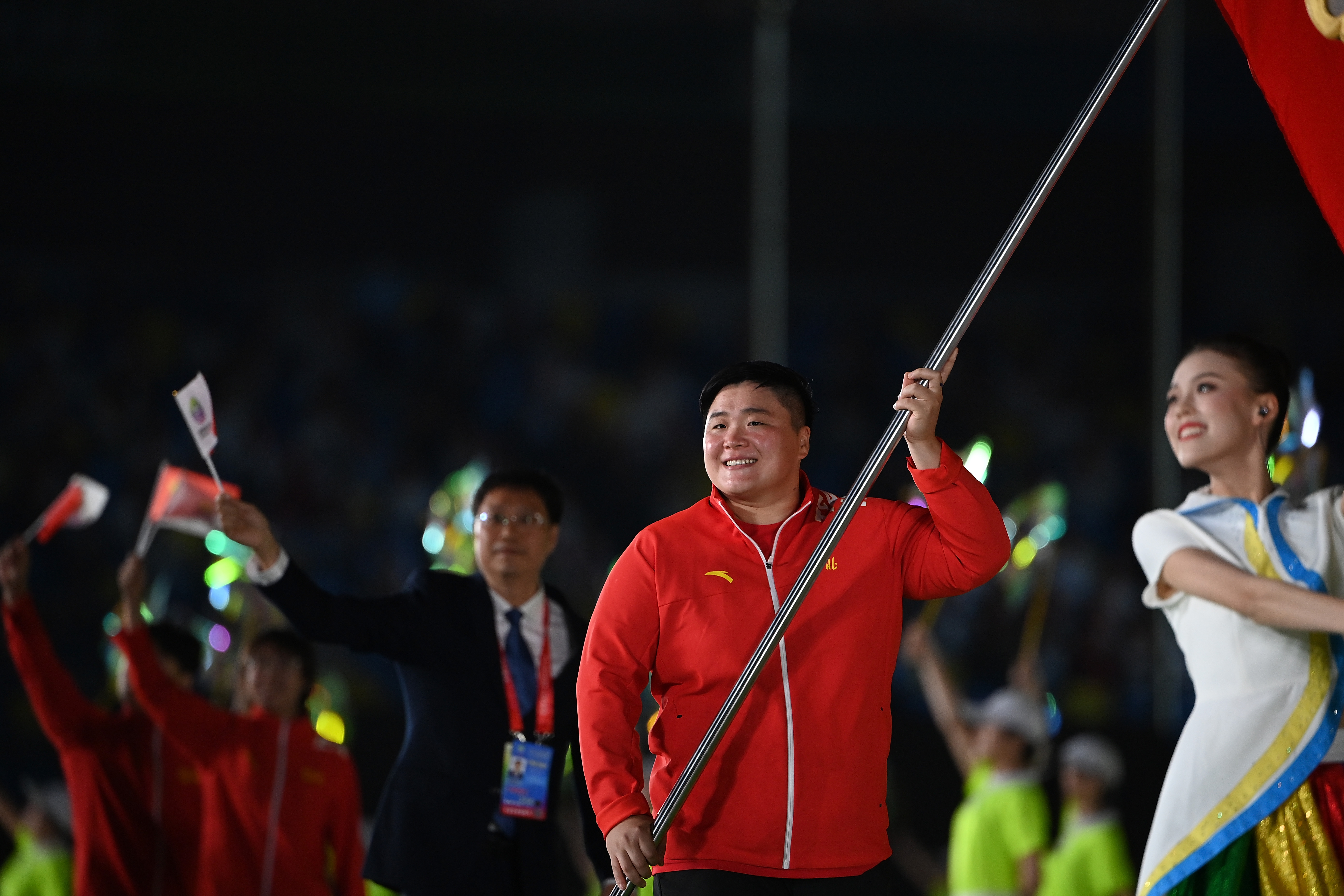9月15日,河北省体育代表团旗手巩立姣在入场仪式上。新华社记者张博文摄