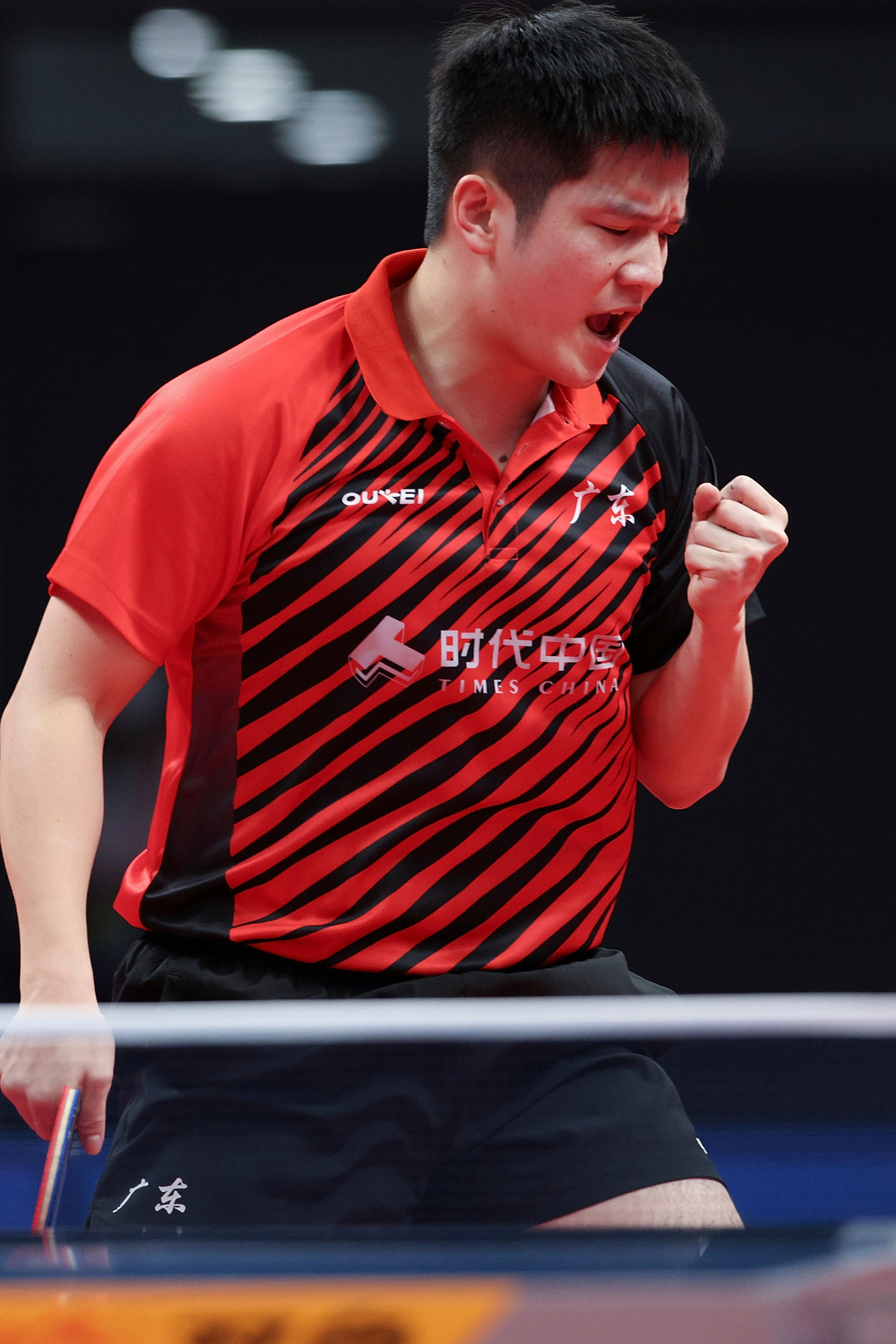 9月21日,广东队选手樊振东在战胜北京队选手马龙后庆祝。新华社记者 张涛 摄