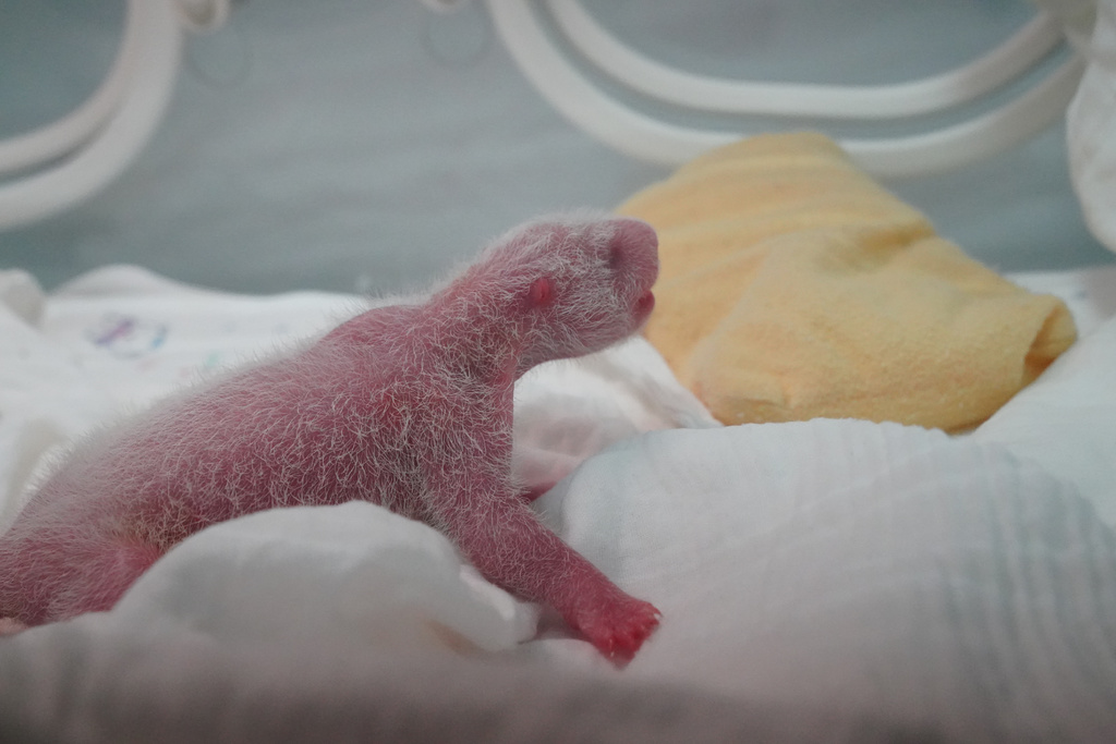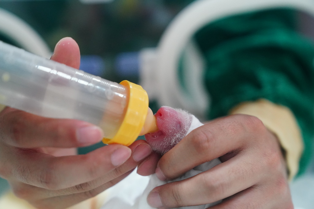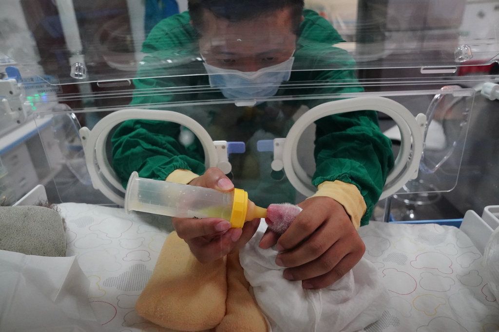 据介绍,圈养大熊猫产下双胞胎以后,只能哺育其中一只幼崽,另一只则由人工育幼。繁育园旁边的办公楼,就是育幼室,育幼员正在为家美崽刺激排便,由于大熊猫是天生的早产儿,各器官发育不完全,需要外界刺激帮助其排便。