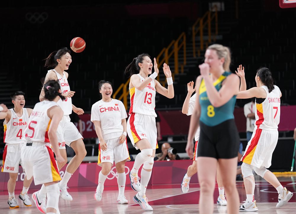7月30日,在东京奥运会女子篮球预赛中,中国队战胜澳大利亚队,提前锁定八强席位。图为中国队球员庆祝胜利。新华社记者 孟永民 摄
