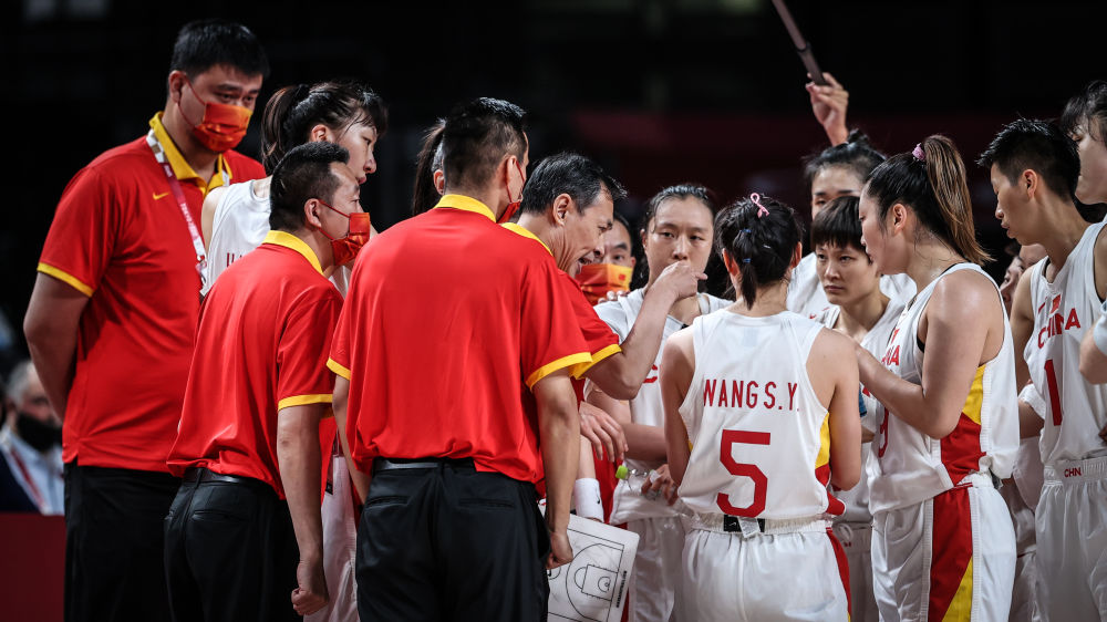 8月4日,中国队在东京奥运会女子篮球四分之一决赛赛间布置战术。新华社记者 潘昱龙 摄