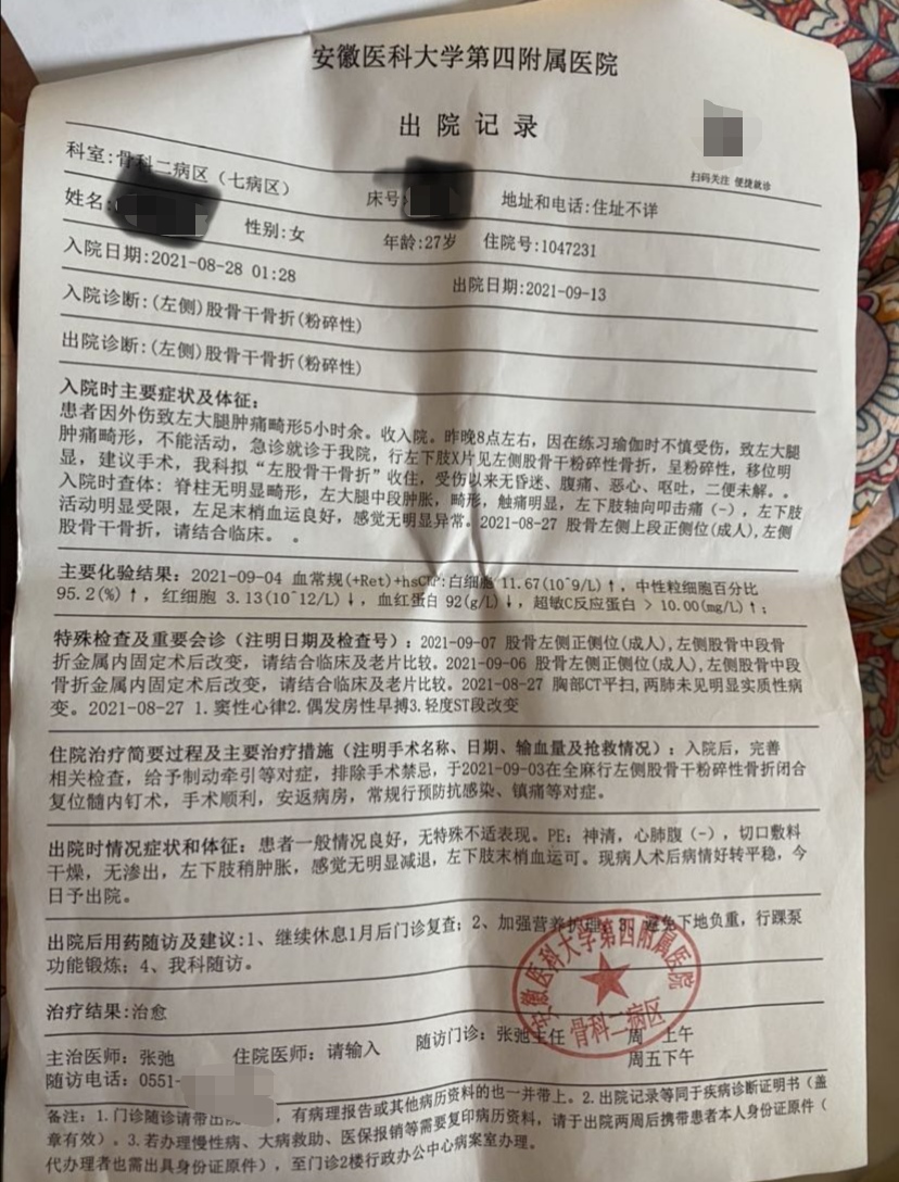 在合肥工作的“90后”庞女士告诉封面新闻记者,8月27日晚,她在合肥新站区一家瑜伽馆练习时,被私教压腿导致左腿粉碎性骨折。