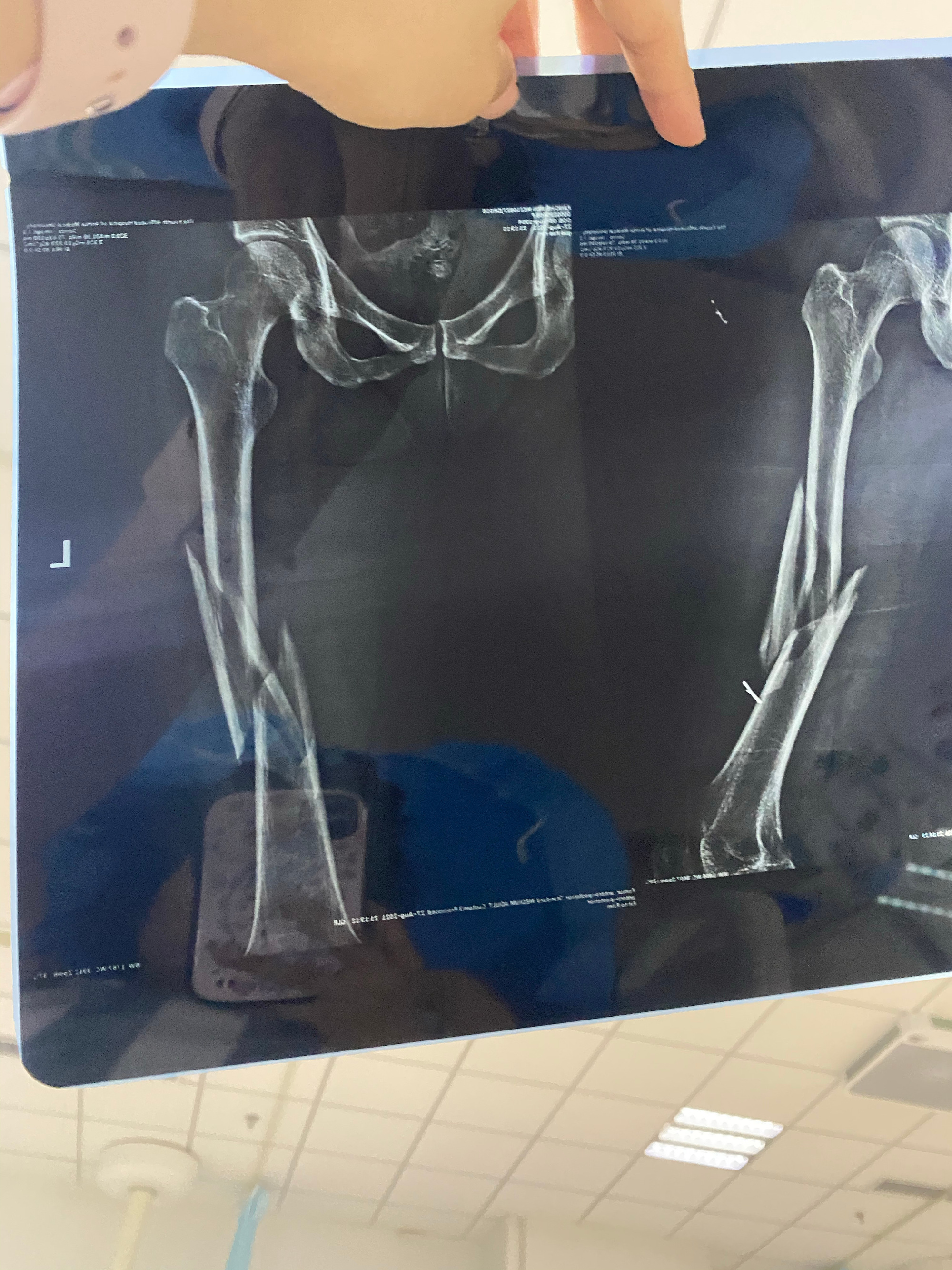据庞女士提供的一份安徽医科大学第四附属医院出院记录显示,患者因外伤致左大腿肿痛畸形5小时余,收入院。行左下肢x片见左侧股骨干粉碎性骨折,呈粉碎性,移位明显。9月3日,在全麻行左侧股骨干粉碎性骨折闭合复位髓内钉术。9月13日,患者出院。