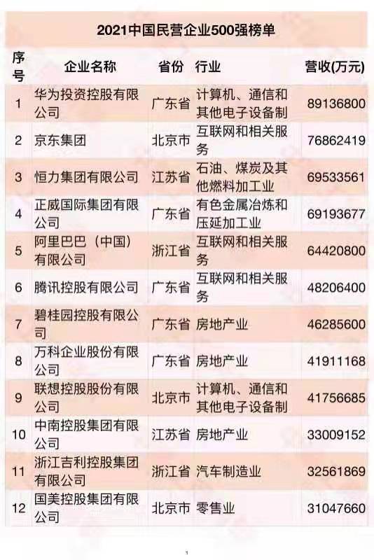 榜单显示,华为以8913.68亿元的营业收入规模位居榜首,京东集团、恒力集团有限公司分别位列第二和第三位;同时,京东位居中国服务业民营企业第一位。