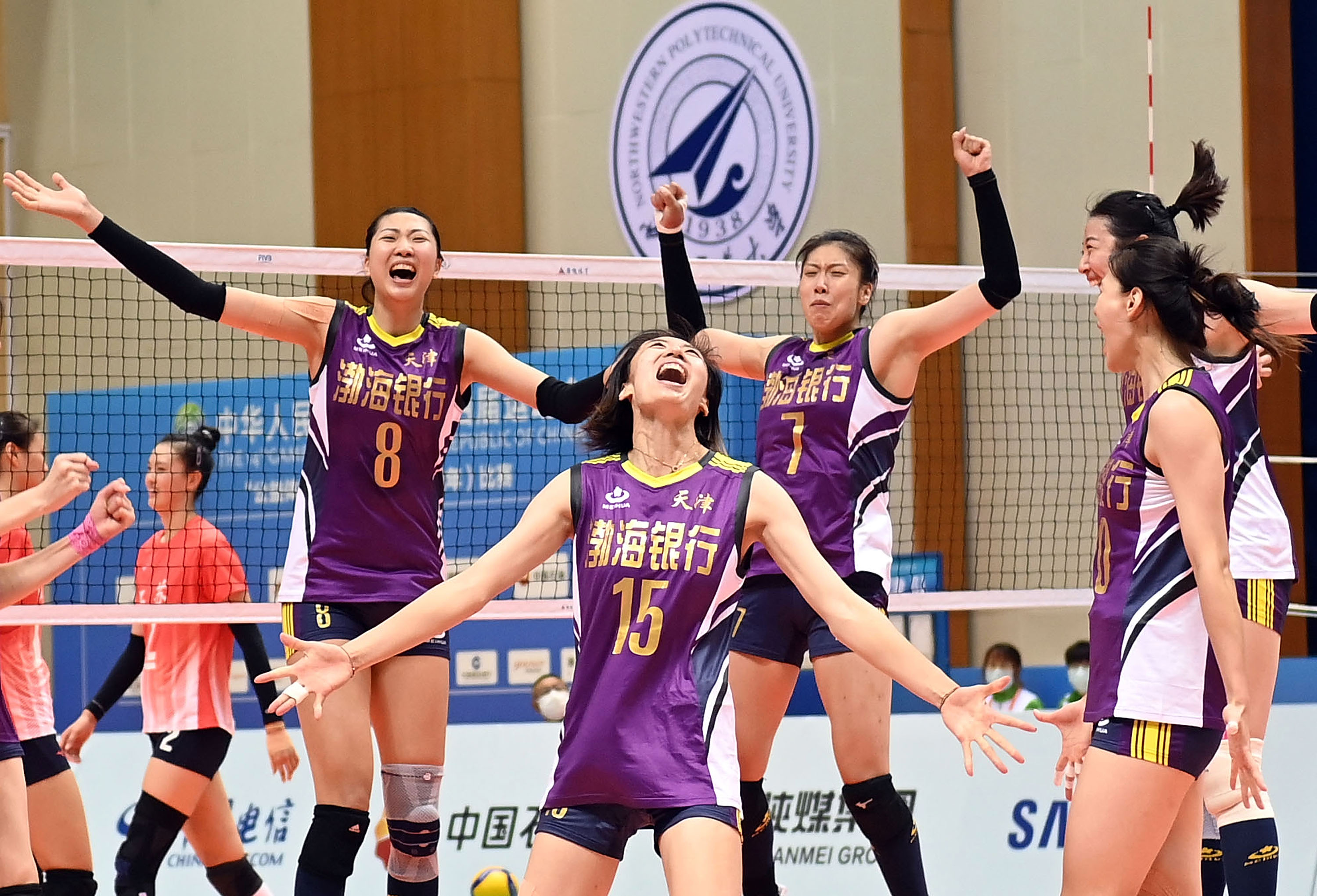 9月26日,天津队球员在第十四届全运会排球女子成年组决赛中以3比1战胜江苏队,获得金牌。新华社记者金良快摄