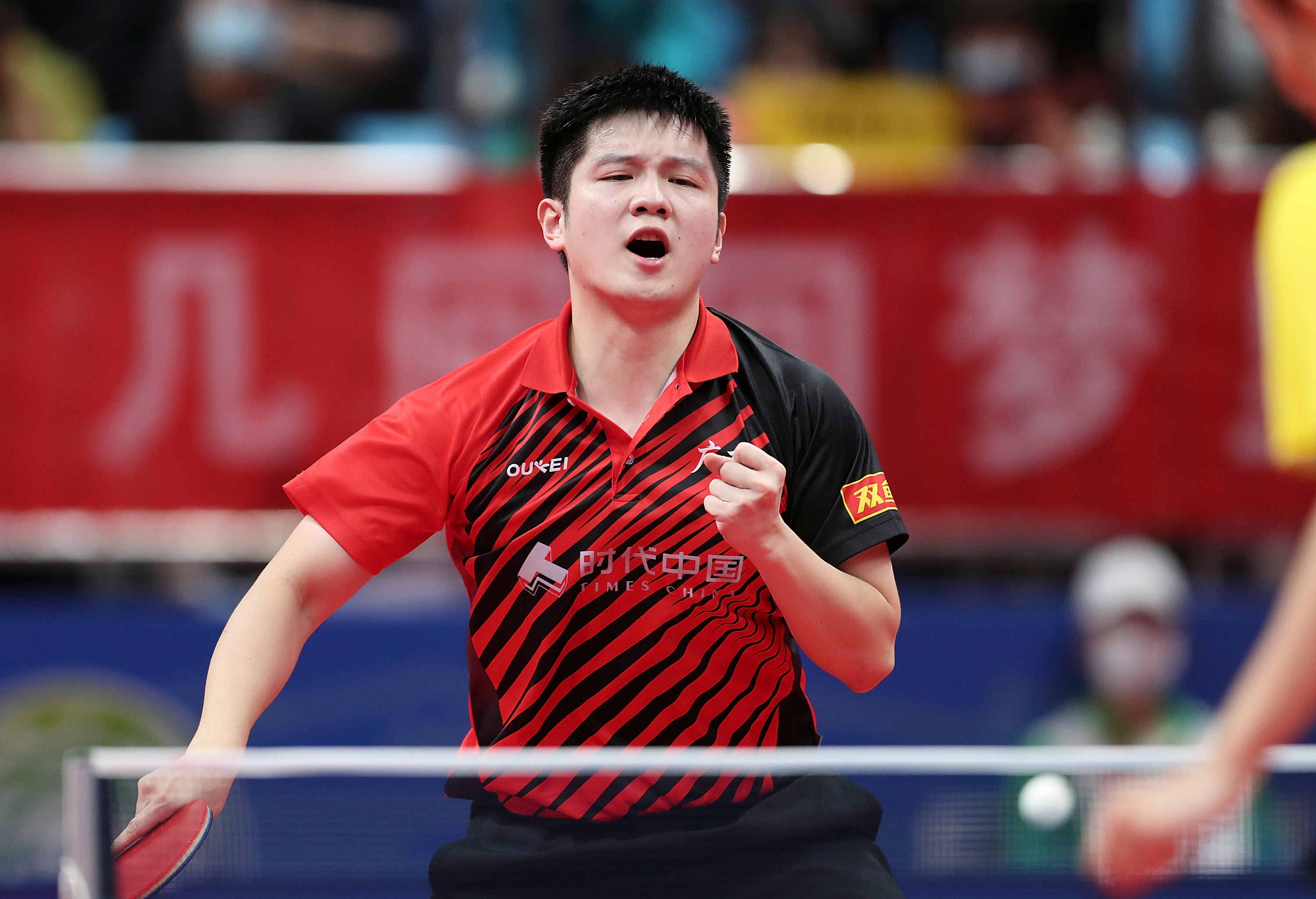 9月26日,广东队选手樊振东庆祝获胜。新华社记者张涛摄