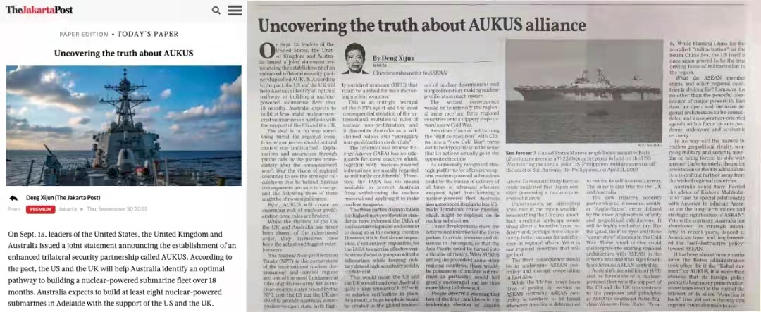 9月30日,印尼《雅加达邮报》及其网站分别刊发中国驻东盟大使邓锡军署名文章《美英澳三边安全伙伴关系:戳破谎言看事实》。