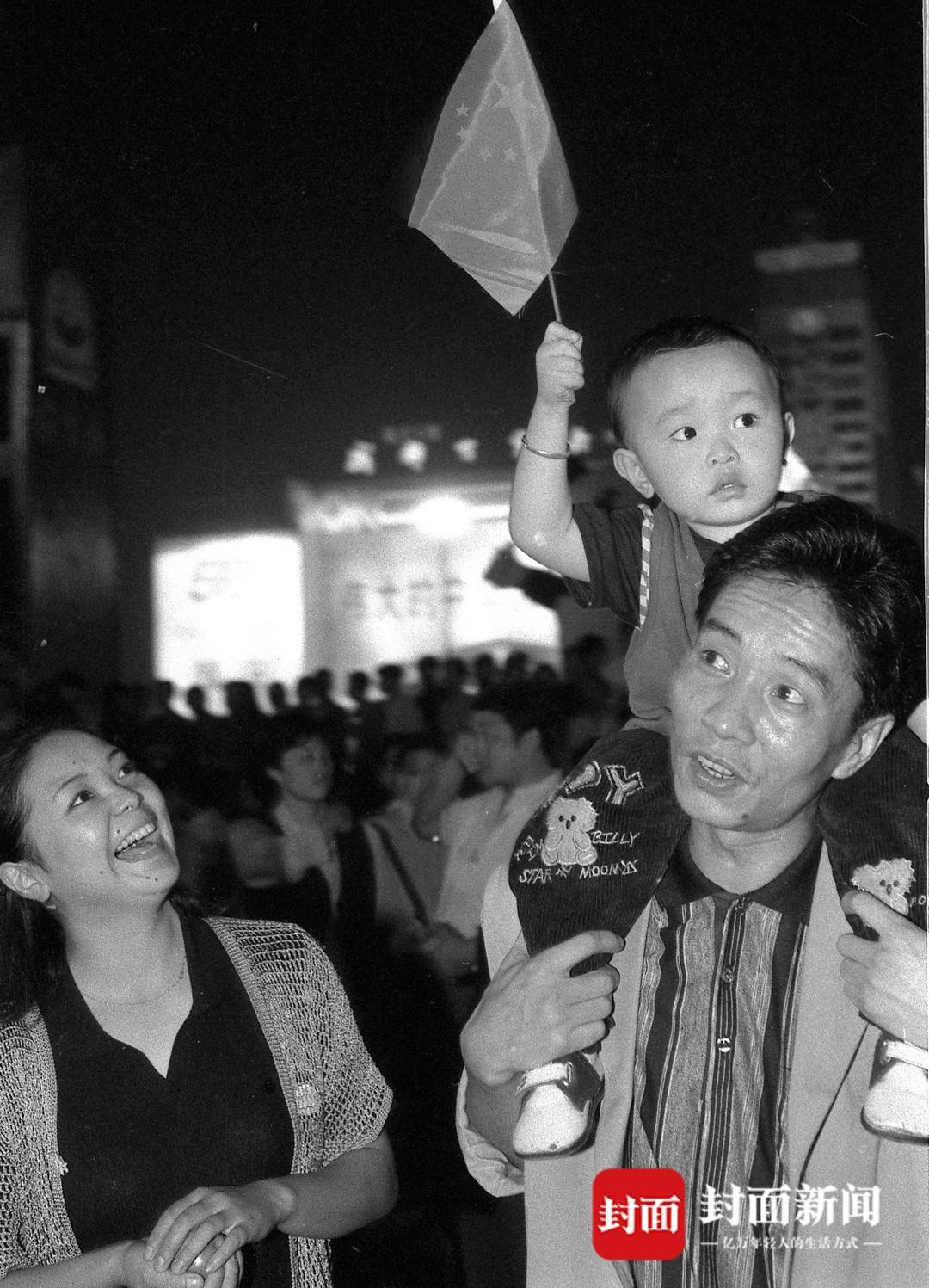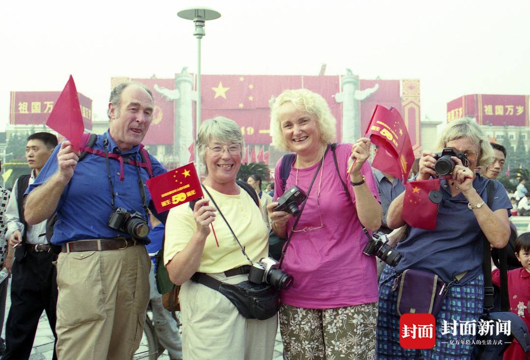 1999年国庆节,外国友人在天府广场与市民共庆国庆