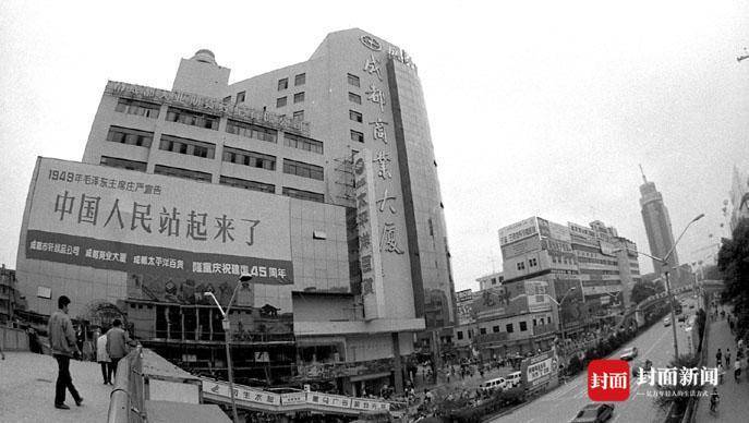 1994年,国庆45周年。春熙路北口商业大厦挂的庆祝横幅,那时,太平洋百货刚开张不久。