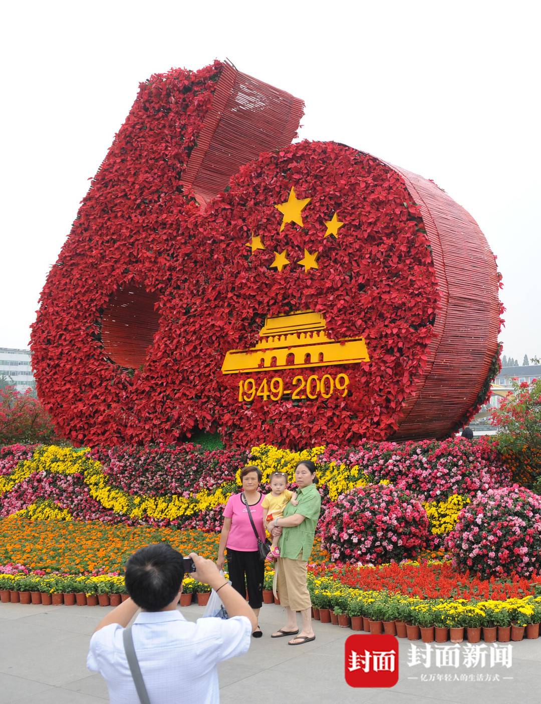 2009年国庆节,市民在天府广场的庆祝中华人民共和国成立60周年的花篮前合影留念。