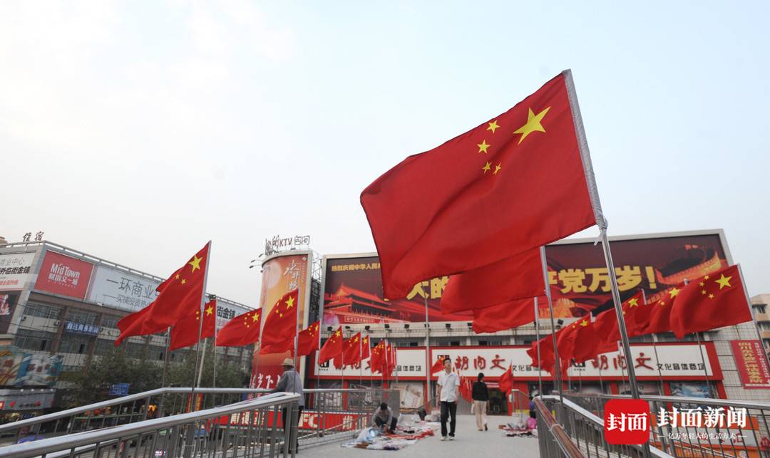 2009年国庆,成都一环路建设路口的人行天桥国旗飘扬,庆祝建国60周年。