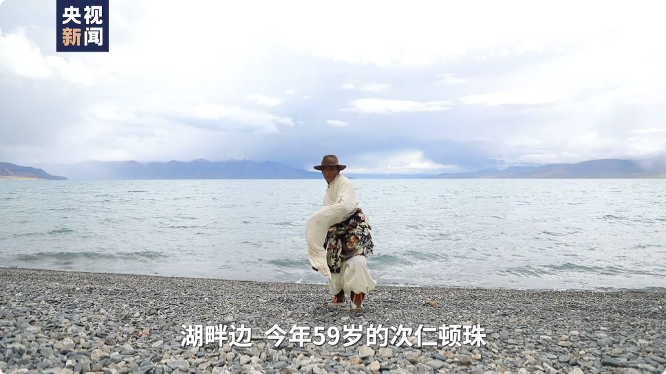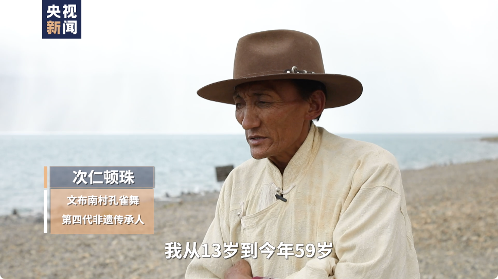 湖畔边,今年59岁的次仁顿珠,穿着传统的服饰,甩起长长的白袖,跳起了从先辈那里传承下来的孔雀舞。