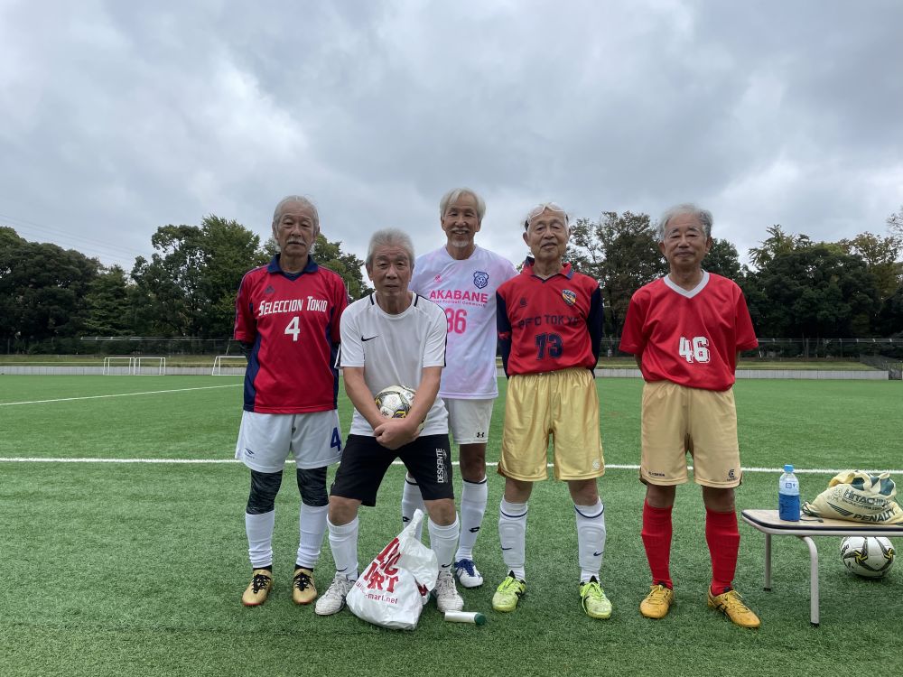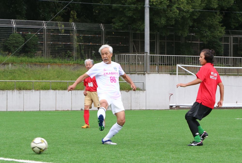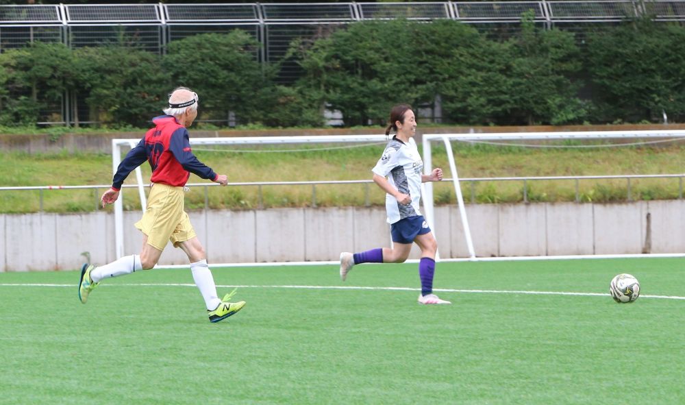 训练赛分为三节,每节大约15分钟。比赛临近结束,雨早就停了,60岁组的球员陆陆续续到来,最后来了近20人。与妈妈桑们一起训练比赛似乎并不过瘾, 猪鼻孝之和北村兴二决定留下来,与60岁组一起活动,因为刚才的训练在半场内举行,接下来大家终于可以在整场展开了。