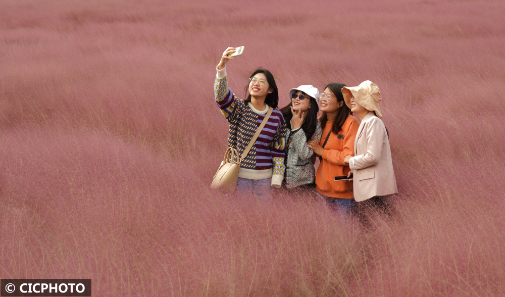 ↑2021年10月11日,游客在山东省临沂市沂南县朱家林田园综合体的粉黛乱子草丛中拍照游玩。CICPHOTO/尹君 摄