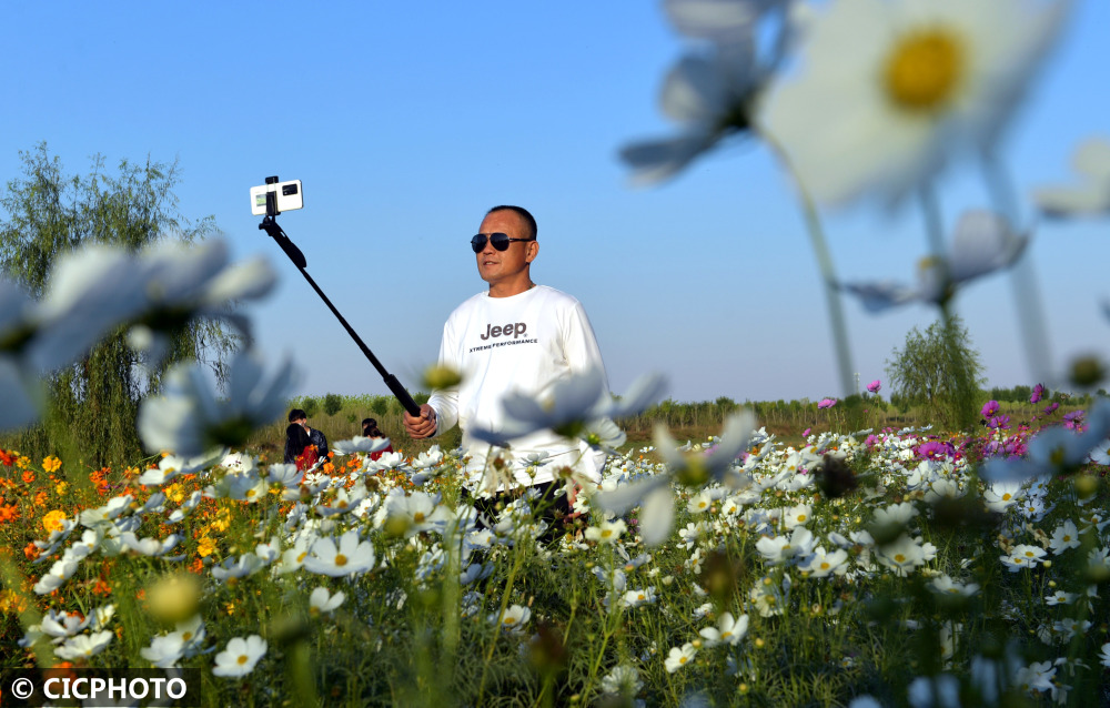 ↑2021年10月17日,游客在河南省商丘市夏邑县龙港湾十里花海赏花拍照。CICPHOTO/苗育才 摄