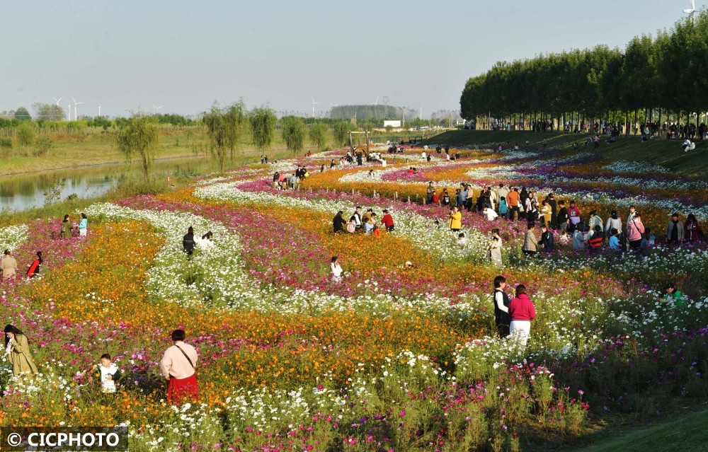 ↑2021年10月17日,游客在河南省商丘市夏邑县龙港湾十里花海赏花游玩。CICPHOTO/苗育才 摄