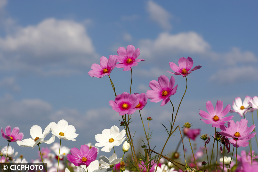 ↑2021年10月8日在安徽省黄山市歙县“四月乡村”现代休闲农业产业园拍摄的波斯菊。CICPHOTO/施亚磊 摄