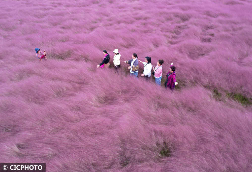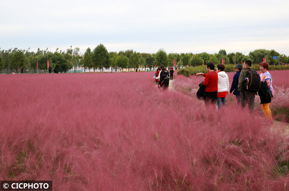 ↑2021年10月10日,游客在北京市怀柔区杨宋镇影都花海观赏粉黛乱子草。CICPHOTO/卜向东 摄