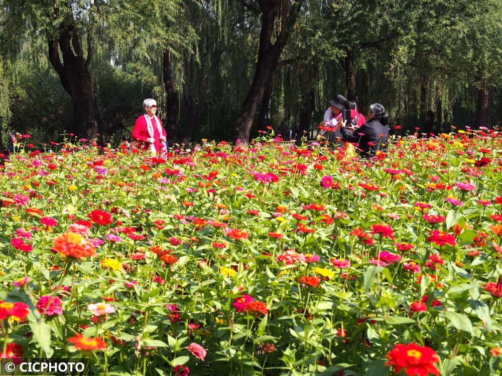 ↑2021年10月18日,游客在北京圆明园遗址公园赏花拍照。CICPHOTO/杜建坡 摄