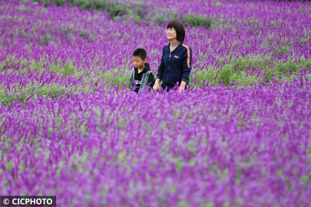 ↑2021年10月10日,游客在山东省临沂市沂南县朱家林田园综合体的鼠尾草丛中游玩。CICPHOTO/王彦冰 摄