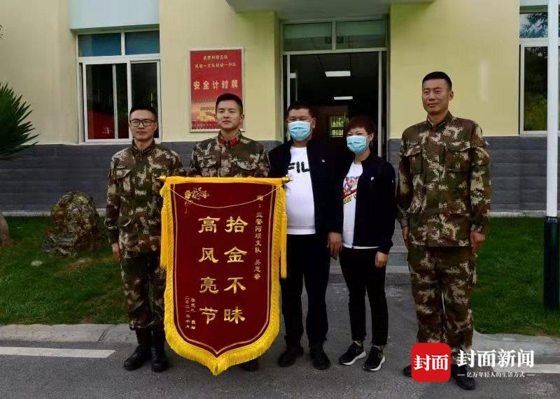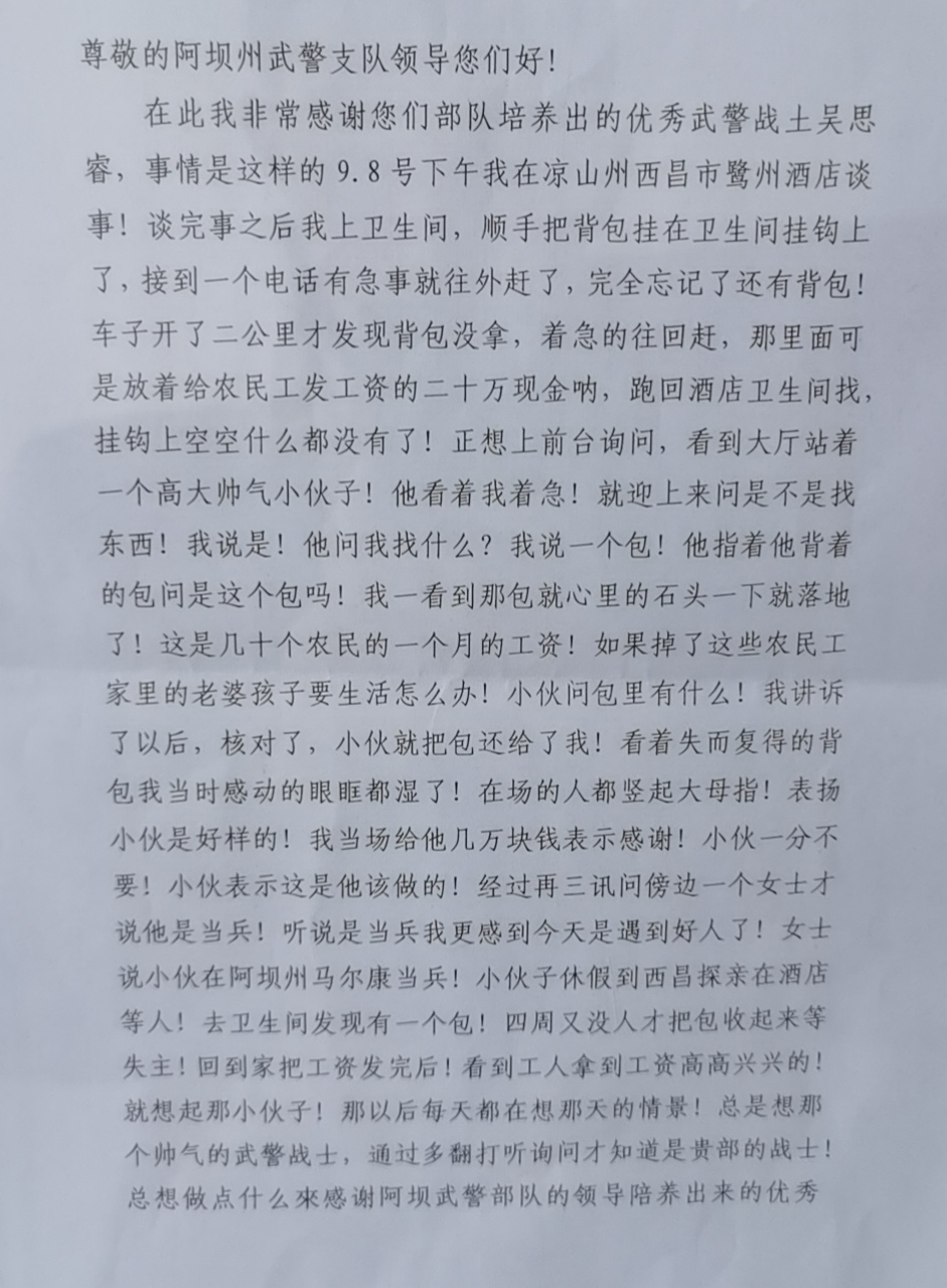 说来好巧,几天后,廖成礼和吴思睿的干爹喝茶时摆起这个龙门阵,才意外获知捡钱的无名英雄叫吴思睿,在阿坝当兵。当时,他萌发了要去部队送锦旗的想法。由于手头事情有点多,再加上回老家过中秋和国庆,便把这个事情安排在国庆后。