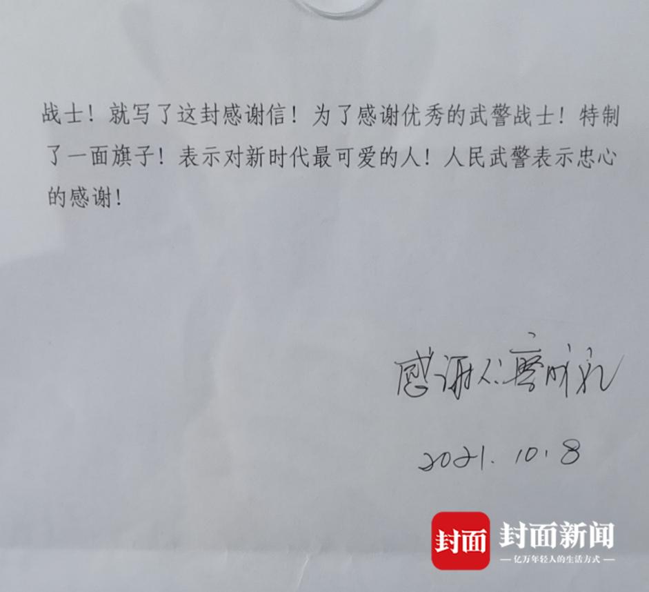10月9日,他带着锦旗,驾着车,从西昌出发,前往武警四川总队阿坝支队,将一份印着“拾金不昧,高风亮节”的锦旗和感谢信交到了吴思睿手中。至此,吴思睿休假期间拾金不昧的善举才被战友们知晓。