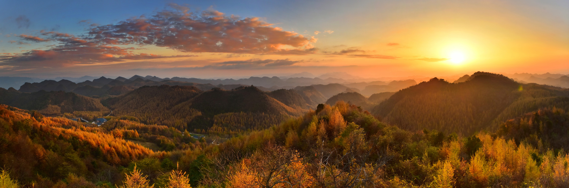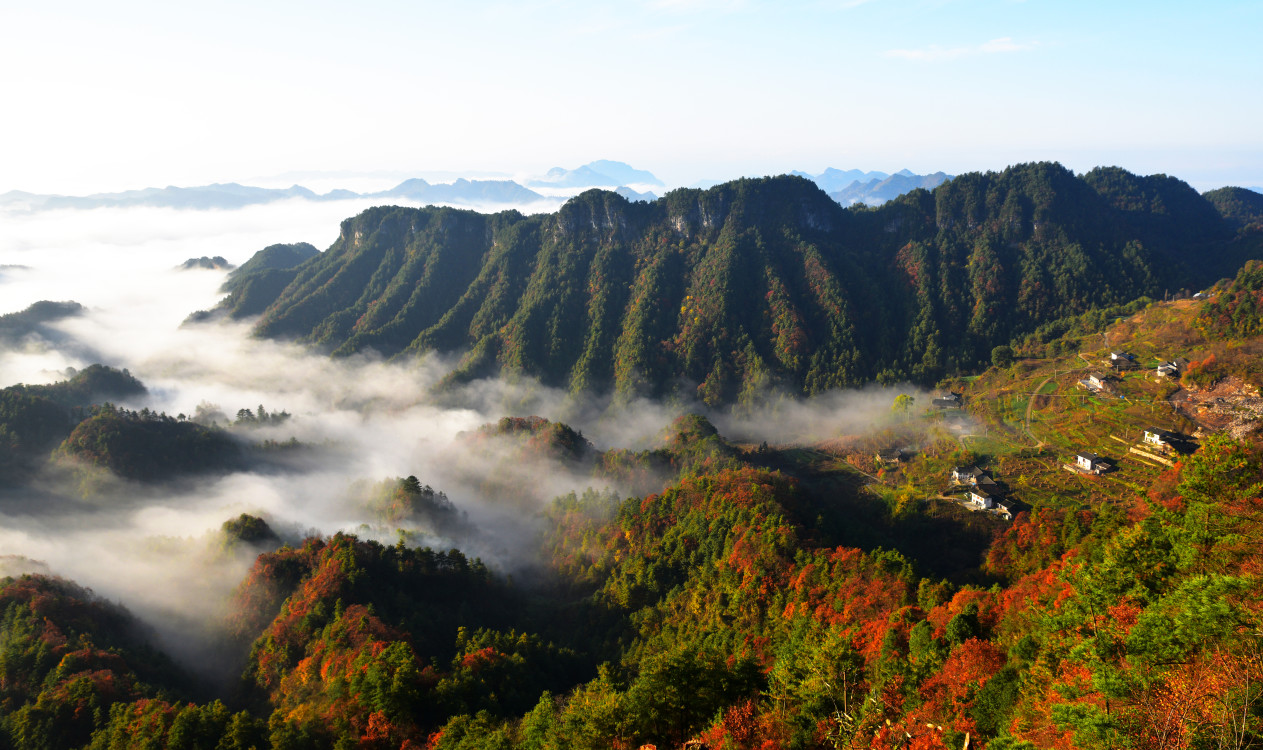 而作为“全国十佳红叶观赏地”曾家山喀斯特彩林核心区的李家镇,平均海拔1460米,森林覆盖率高达80%以上,辖区内有上万亩原始森林。一到金秋时节,森林里的落叶松、野枫、青杠以及其他名目繁多的各种杂树就相继披上了斑斓的彩衣,一眼望去,沟壑峡谷、山麓坡岭、漫山遍野,色如浓焰、如火如荼、似晚霞映红群山,美不胜收,吸引着四面八方的游客纷至沓来。