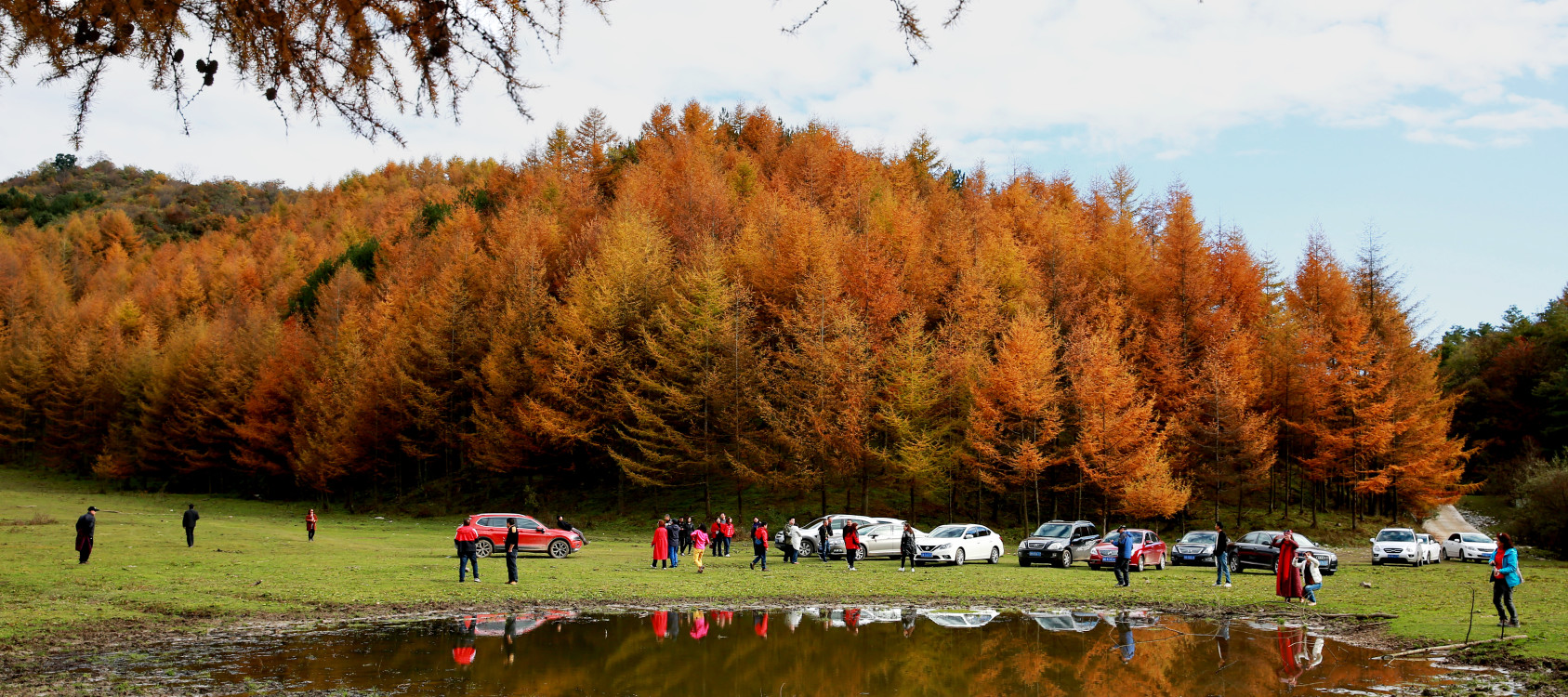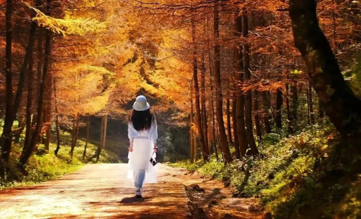 其中,又以鸳鸯池森林公园金色落叶松林和天然次生彩叶林景观最具特色。鸳鸯池森林公园所处区域喀斯特岩溶地貌广泛发育,绵延约15km的边界线均为斧劈刀削般的绝壁,高200-400m不等,整体呈灰白色,远观绵延不绝、气势磅礴,素有“十里绝壁、万亩彩林”之美誉,行走其间,仿佛置身于“车行十里画屏上,身走四方彩林中”的梦幻童话世界。