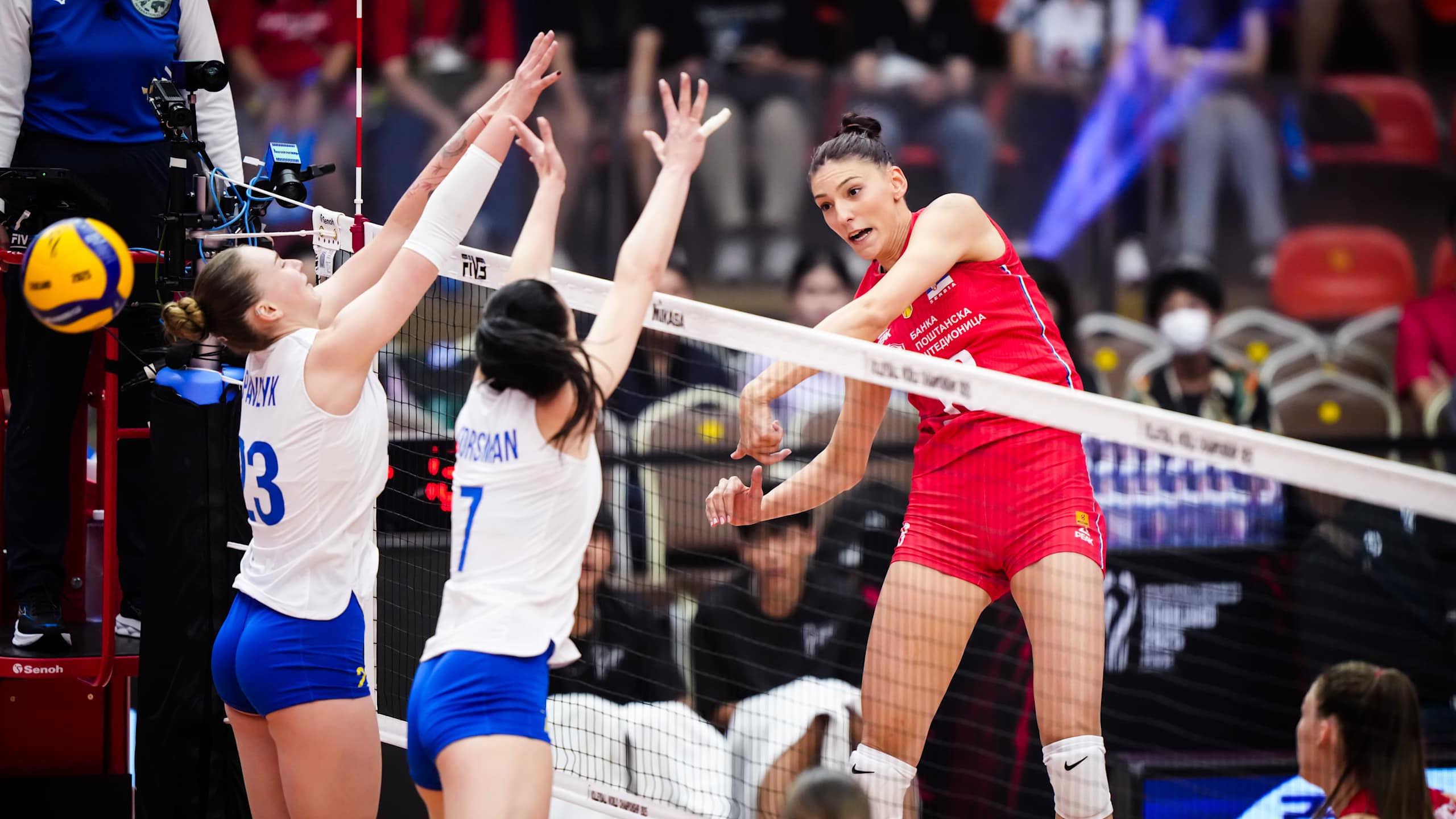 8月23日,塞尔维亚队博斯科维奇(右一)在比赛中扣球。图片来源:国际排联官网