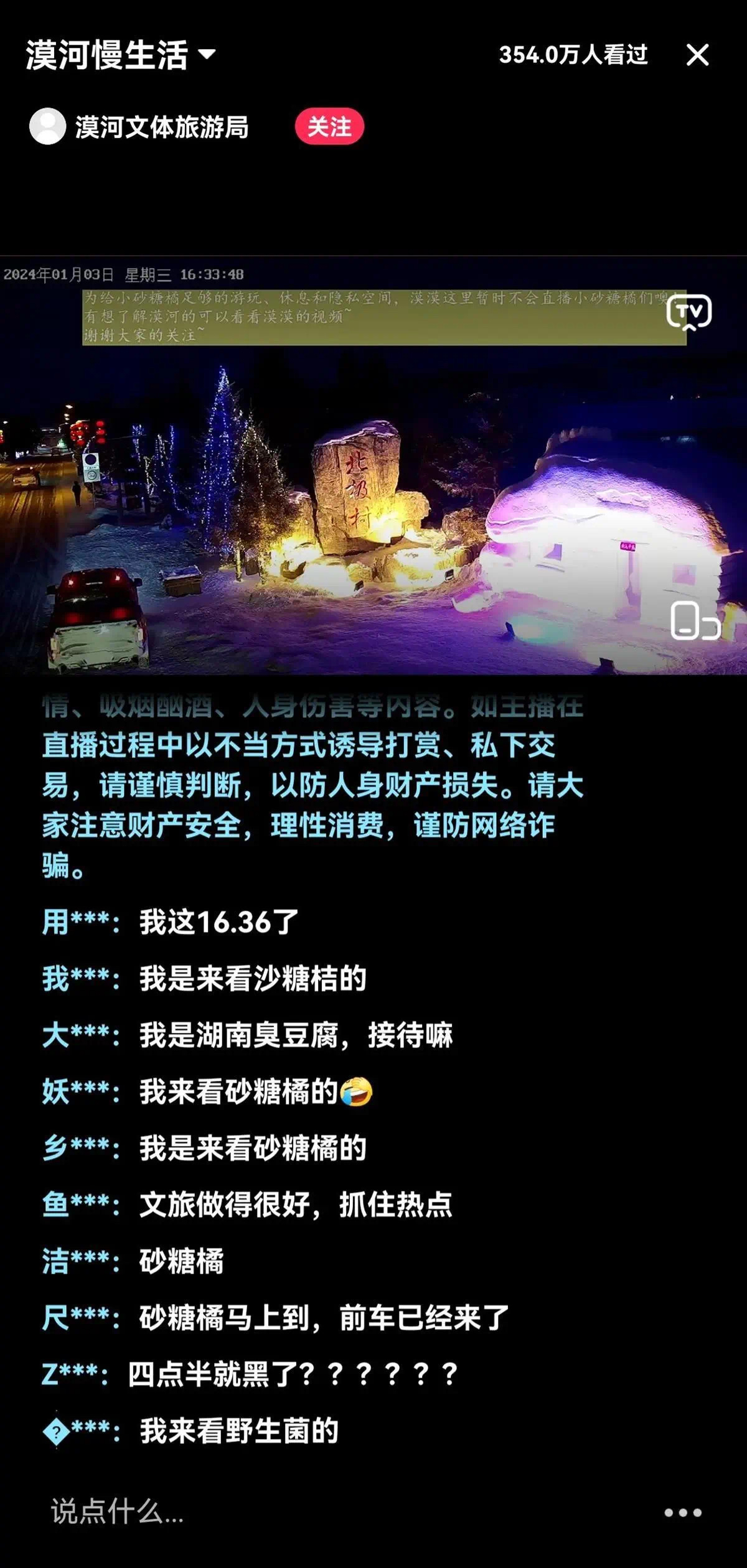 “砂糖橘”们在漠河游玩时,漠河慢生活直播间截图。(图源直播)