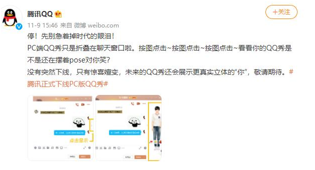 11月9日,针对PC端QQ秀将下线传闻,腾讯方面回应称,PC端QQ秀只是折叠在聊天窗口,并未正式下线。