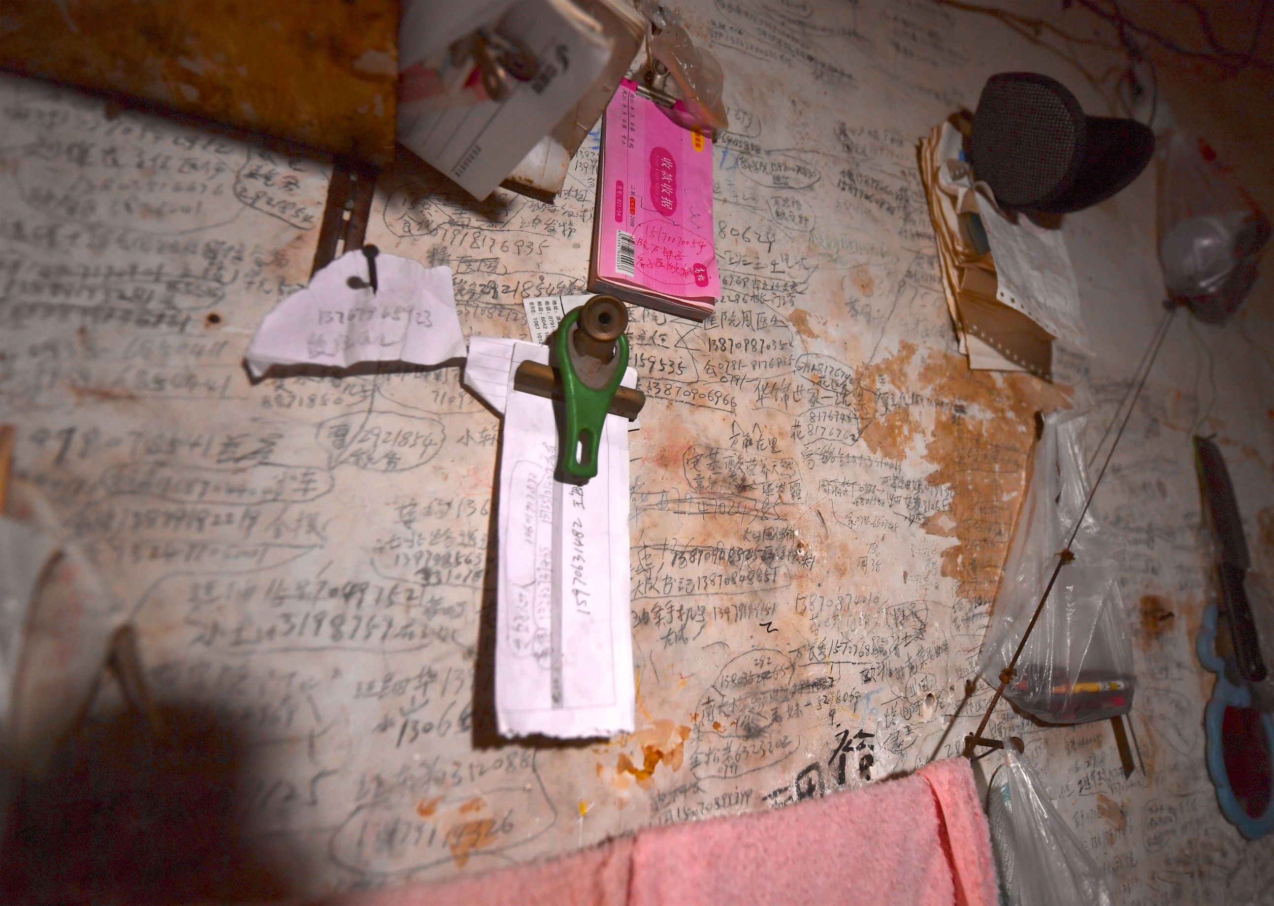 万佐成和熊庚香家中斑驳的墙壁上写满了10多年来患者和家属留下的电话号码(2018年1月9日摄)。他们希望老两口今后也能去他们家中做客。新华社记者胡晨欢摄