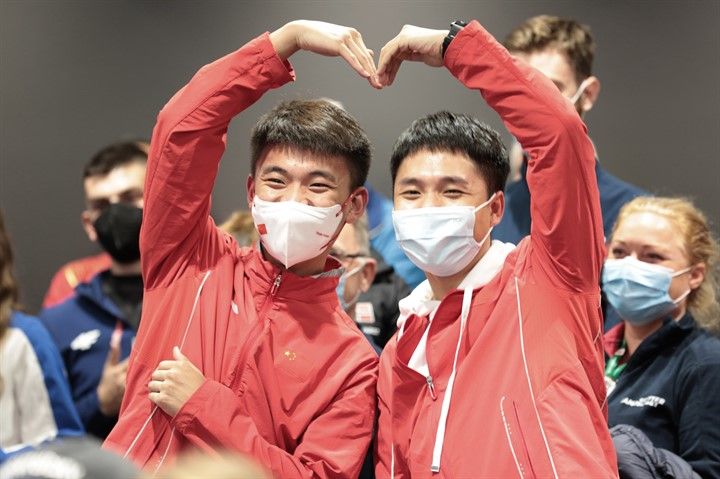 两位东京奥运会冠军张常鸿(左)与杨皓然在赛前抽签仪式上“比心”。
