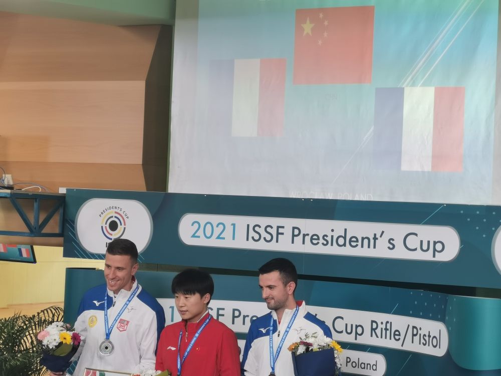 李越宏(中)在男子25米手枪速射颁奖仪式上。国家步手枪射击队供图