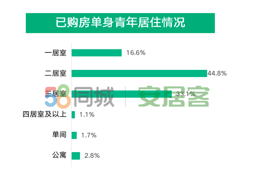 在居住空间方面,39.2%的单身青年居住在二居室,已购房的单身青年中,有44.8%的人选择了二居室,33.1%的人居住在三居室。名下无房、租房居住的单身青年中,居住在一居室的人占比41.6%,远高于已购房单身青年。