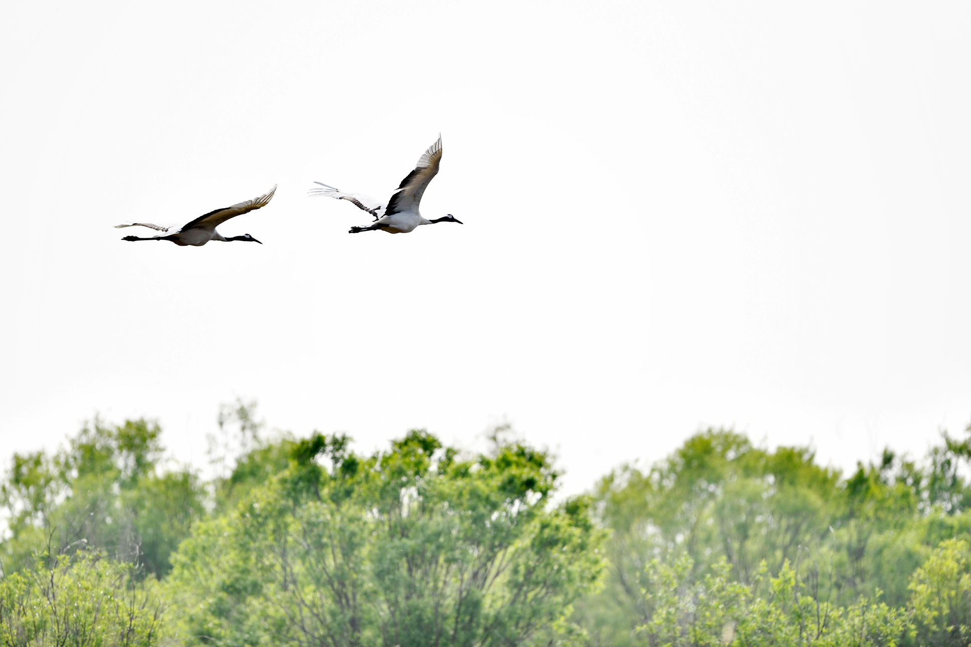 两只丹顶鹤飞越山东黄河三角洲国家级自然保护区的树丛。(新华社记者郭绪雷 摄)