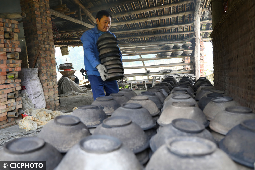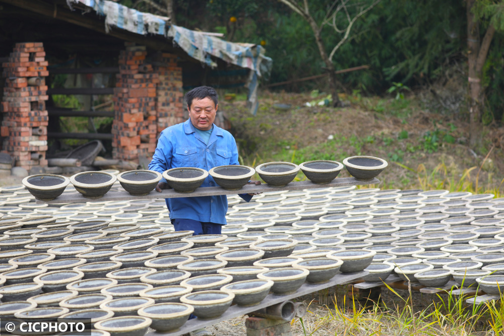 ↑2021年11月13日,在重庆市梁平区礼让镇新拱村八组,砂陶师傅在室外晾晒砂陶坯子。CICPHOTO/刘辉 摄