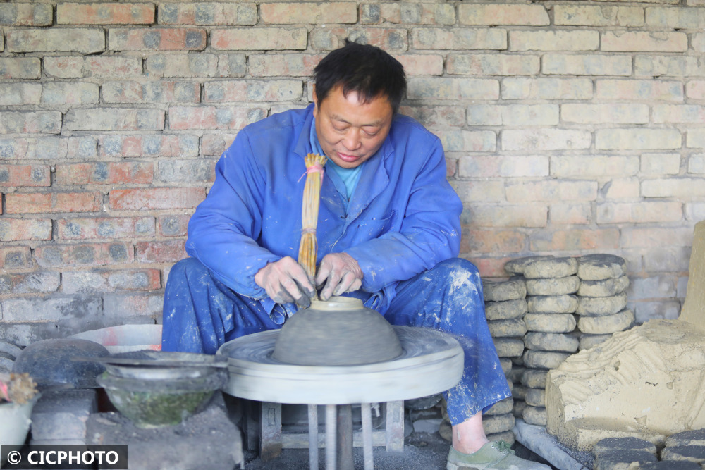 ↑2021年11月8日,在重庆市梁平区礼让镇新拱村八组,砂陶师傅在制作砂陶。CICPHOTO/刘辉 摄