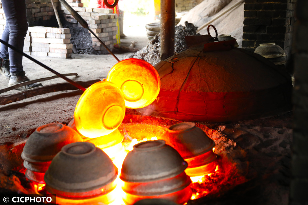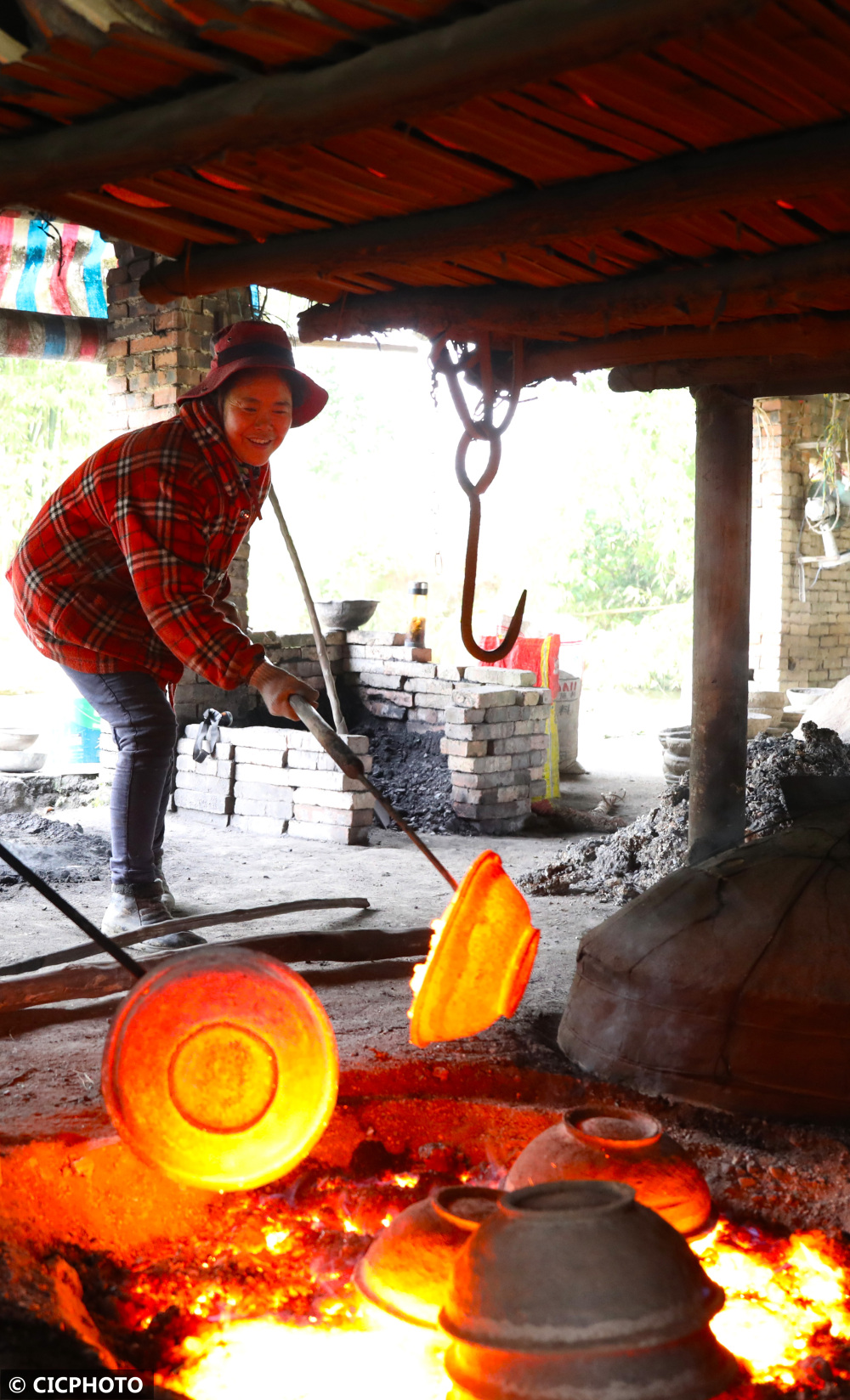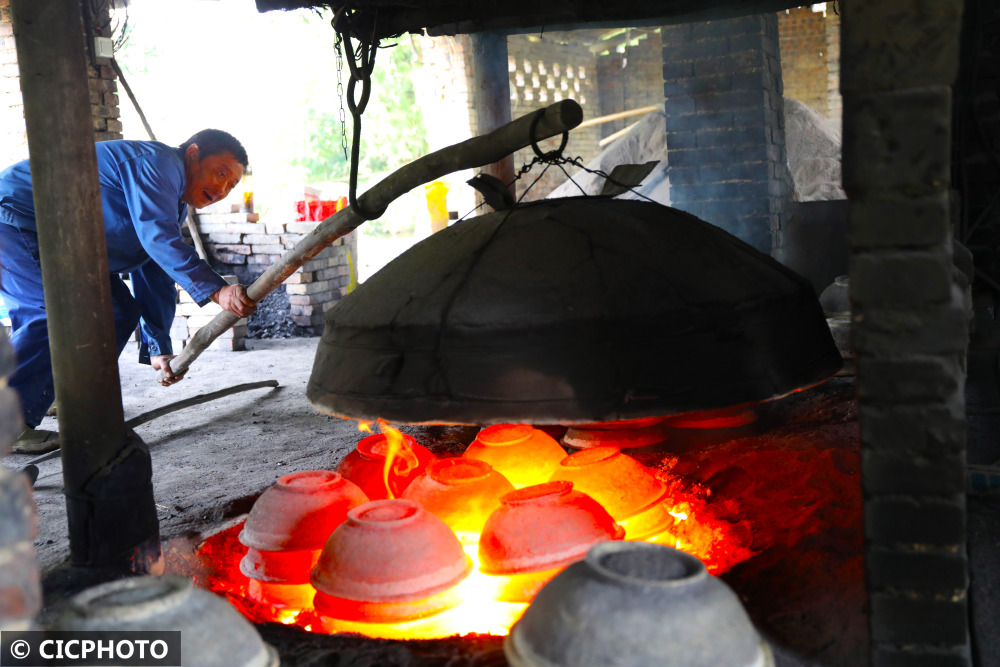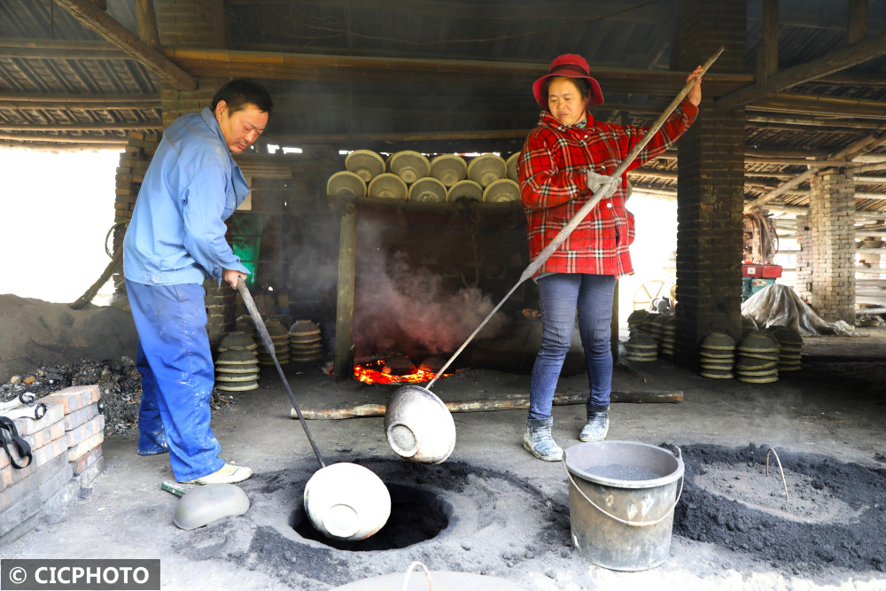 ↑2021年11月13日,在重庆市梁平区礼让镇新拱村八组,梁平砂陶师傅用铁钩取出经过300摄氏度高温烧制的砂陶。CICPHOTO/刘辉 摄